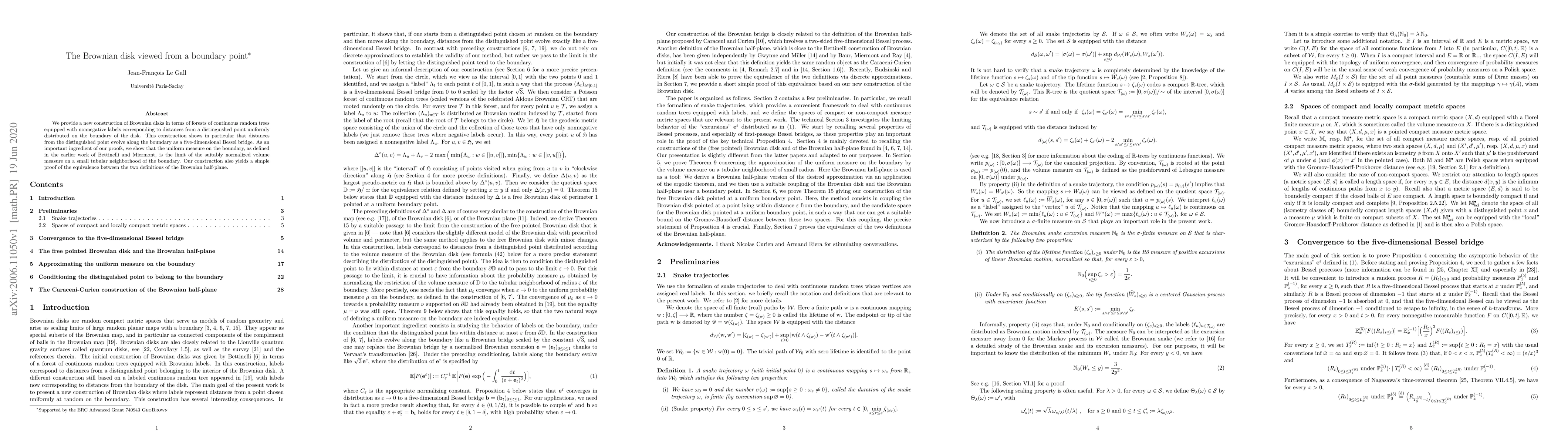 This paper constructs Brownian disks using forests of continuous random trees labeled by distances from a boundary point, revealing that these distances evolve as a five-dimensional Bessel bridge. It also proves the equivalence between two definitions of the Brownian half-plane and shows the uniform boundary measure's convergence to the volume measure.
