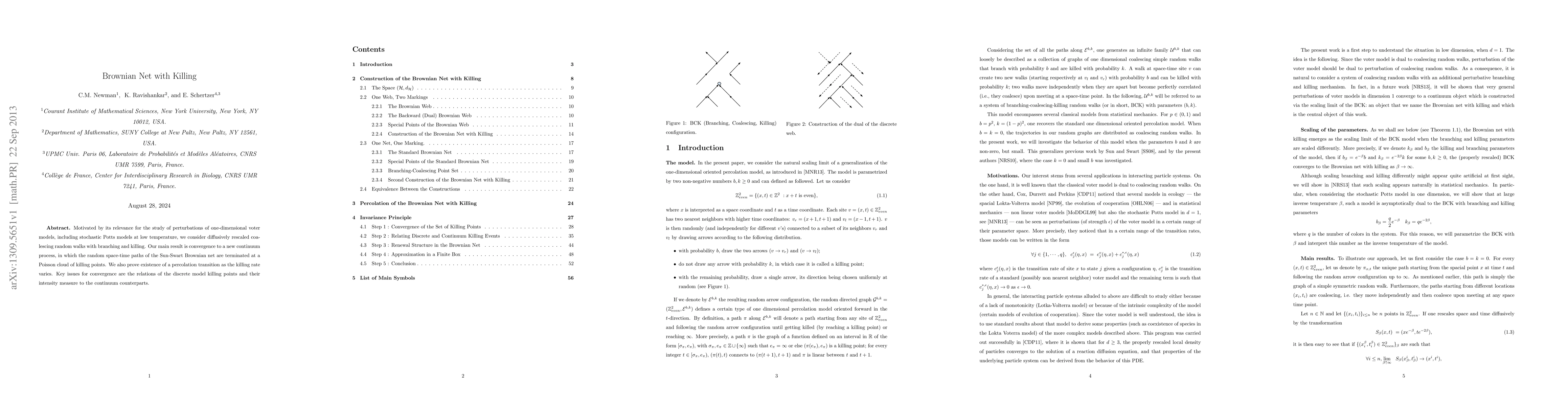 This paper studies diffusively rescaled coalescing random walks with branching and killing, showing convergence to a new continuum process called the Sun-Swart Brownian net with killing. It also demonstrates a percolation transition dependent on the killing rate, focusing on the relationship between discrete and continuum killing points.