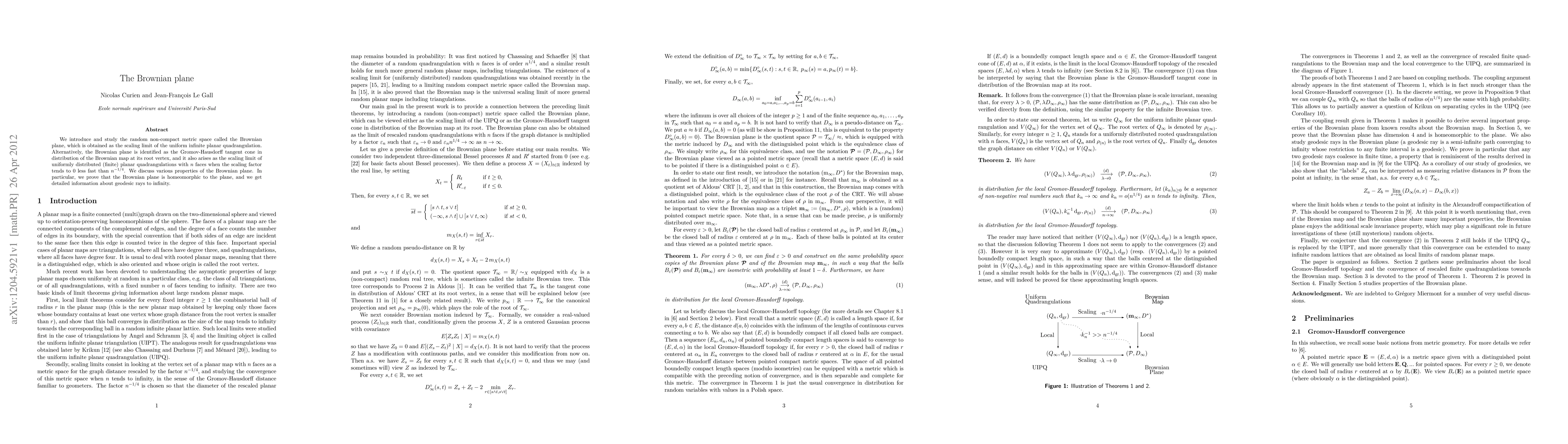 The Brownian plane is the scaling limit of uniform infinite planar quadrangulations and shares properties with the Gromov-Hausdorff tangent cone of the Brownian map. It is homeomorphic to the plane and exhibits detailed geodesic behavior to infinity.