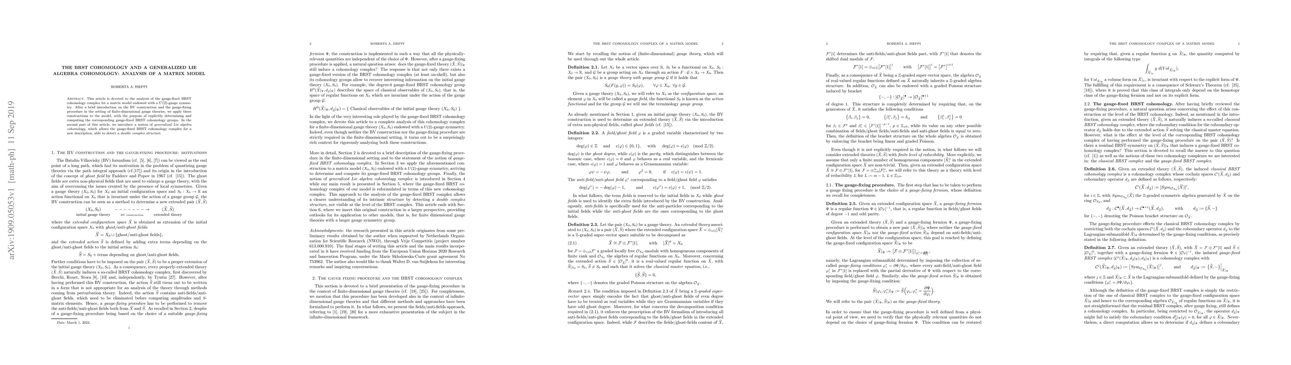 This article is devoted to the analysis of the gauge-fixed BRST cohomology complex for a matrix model endowed with a $U(2)$-gauge symmetry. After a brief introduction on the BV construction and the gauge-fixing procedure in the setting of finite-dimensional gauge theories, we apply these constructions to the model, with the purpose of explicitly determining and computing the corresponding gauge-fixed BRST cohomology groups. In the second part of this article, we introduce a notion of generalized Lie algebra cohomology, which allows the gauge-fixed BRST cohomology complex for a new description, able to detect a double complex structure.