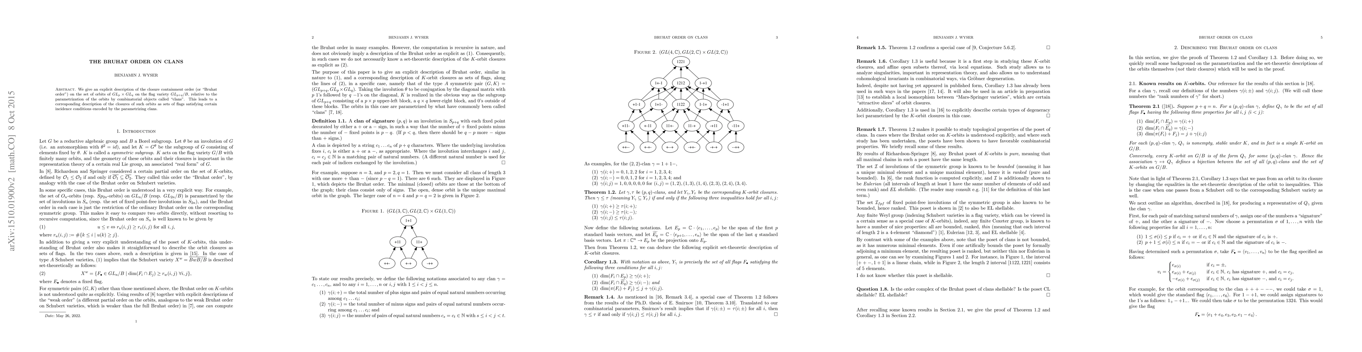 The paper provides an explicit description of the Bruhat order on clans, which are combinatorial objects parametrizing the orbits of GL_p × GL_q on the flag variety GL_{p+q}/B, and outlines how these orbits' closures can be characterized by specific incidence conditions.