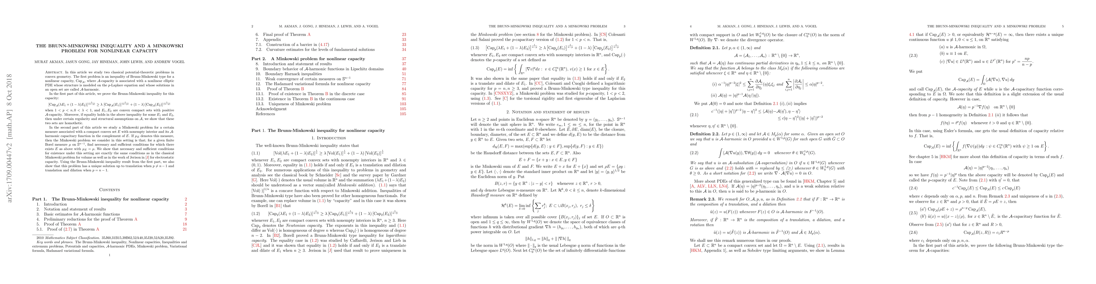 In this article we study two classical potential-theoretic problems in convex geometry corresponding to a nonlinear capacity, $\mbox{Cap}_{\mathcal{A}}$, where $\mathcal{A}$-capacity is associated with a nonlinear elliptic PDE whose structure is modeled on the $p$-Laplace equation and whose solutions in an open set are called $ \mathcal{A}$-harmonic. In the first part of this article, we prove the Brunn-Minkowski inequality for this capacity: \[ \left[\mbox{Cap}_\mathcal{A}(\lambda E_1 +(1-\lambda)E_2)\right]^{\frac{1}{(n-p)}}\geq\lambda\left[\mbox{Cap}_\mathcal{A}(E_1)\right]^{\frac{1}{(n-p)}}+(1-\lambda)\left[\mbox{Cap}_\mathcal{A}(E_2 )\right]^{\frac{1}{(n-p)}} \] when $1