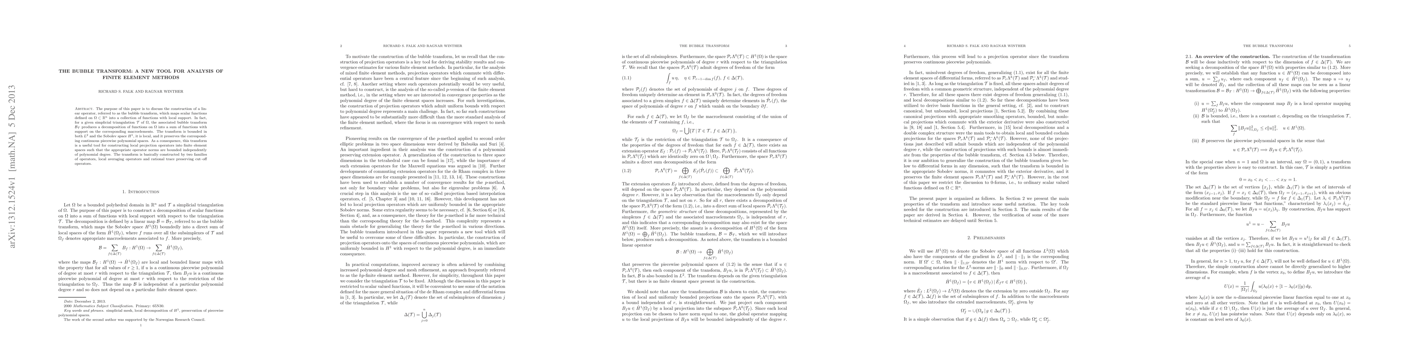 A new tool called the bubble transform is introduced to analyze finite element methods, allowing for efficient construction of local projection operators with bounded operator norms.