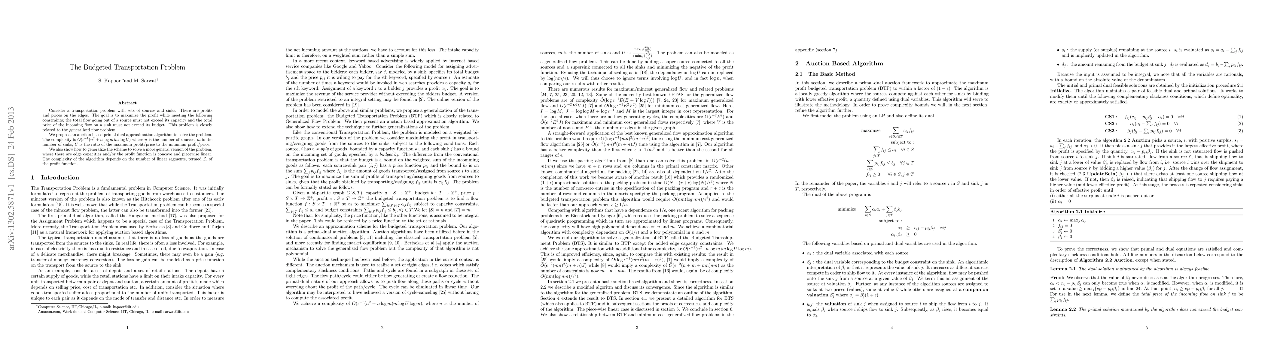 Consider a transportation problem with sets of sources and sinks. There are profits and prices on the edges. The goal is to maximize the profit while meeting the following constraints; the total flow going out of a source must not exceed its capacity and the total price of the incoming flow on a sink must not exceed its budget. This problem is closely related to the generalized flow problem. We propose an auction based primal dual approximation algorithm to solve the problem. The complexity is $O(\epsilon^{-1}(n^2+ n\log{m})m\log U)$ where $n$ is the number of sources, $m$ is the number of sinks, $U$ is the ratio of the maximum profit/price to the minimum profit/price. We also show how to generalize the scheme to solve a more general version of the problem, where there are edge capacities and/or the profit function is concave and piece-wise linear. The complexity of the algorithm depends on the number of linear segments, termed ${\cal L}$, of the profit function.