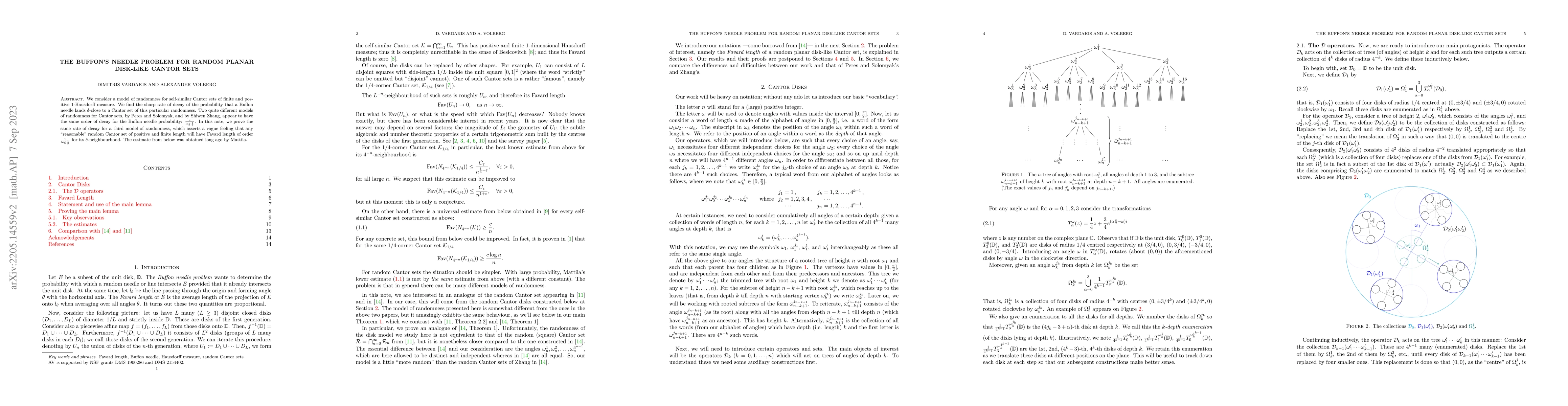 We consider a model of randomness for self-similar Cantor sets of finite and positive $1$-Hausdorff measure. We find the sharp rate of decay of the probability that a Buffon needle lands $\delta$-close to a Cantor set of this particular randomness. Two quite different models of randomness for Cantor sets, by Peres and Solomyak, and by Shiwen Zhang, appear to have the same order of decay for the Buffon needle probability: $\frac{c}{\log\frac{1}{\delta}}$. In this note, we prove the same rate of decay for a third model of randomness, which asserts a vague feeling that any "reasonable" random Cantor set of positive and finite length will have Favard length of order $\frac{c}{\log\frac{1}{\delta}}$ for its $\delta$-neighbourhood. The estimate from below was obtained long ago by Mattila.