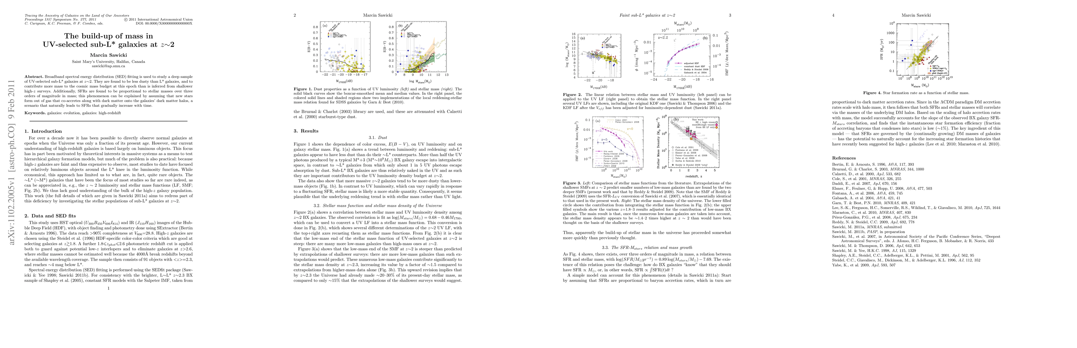 Broadband spectral energy distribution (SED) fitting is used to study a deep sample of UV-selected sub-L* galaxies at z~2. They are found to be less dusty than L* galaxies, and to contribute more mass to the cosmic mass budget at this epoch than is inferred from shallower high-z surveys. Additionally, SFRs are found to be proportional to stellar masses over three orders of magnitude in mass; this phenomenon can be explained by assuming that new stars form out of gas that co-accretes along with dark matter onto the galaxies' dark matter halos, a scenario that naturally leads to SFRs that gradually increase with time.
