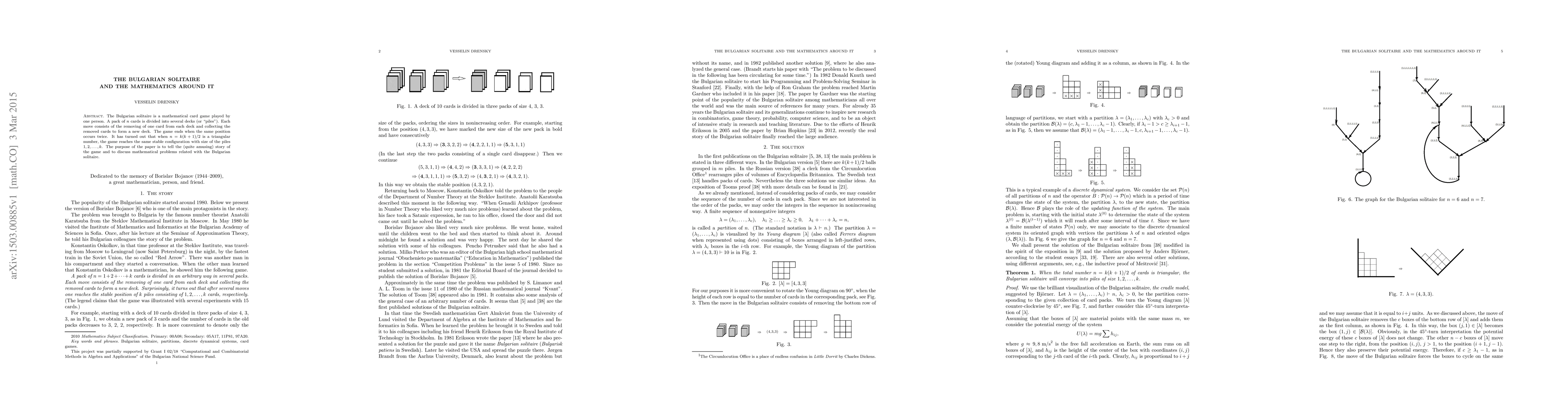 The Bulgarian solitaire is a mathematical card game played by one person. A pack of n cards is divided into several decks (or "piles"). Each move consists of the removing of one card from each deck and collecting the removed cards to form a new deck. The game ends when the same position occurs twice. It has turned out that when n=k(k+1)/2 is a triangular number, the game reaches the same stable configuration with size of the piles 1,2,...,k. The purpose of the paper is to tell the (quite amusing) story of the game and to discuss mathematical problems related with the Bulgarian solitaire. The paper is dedicated to the memory of Borislav Bojanov (1944-2009), a great mathematician, person, and friend, and one of the main protagonists in the story of the Bulgarian solitaire.