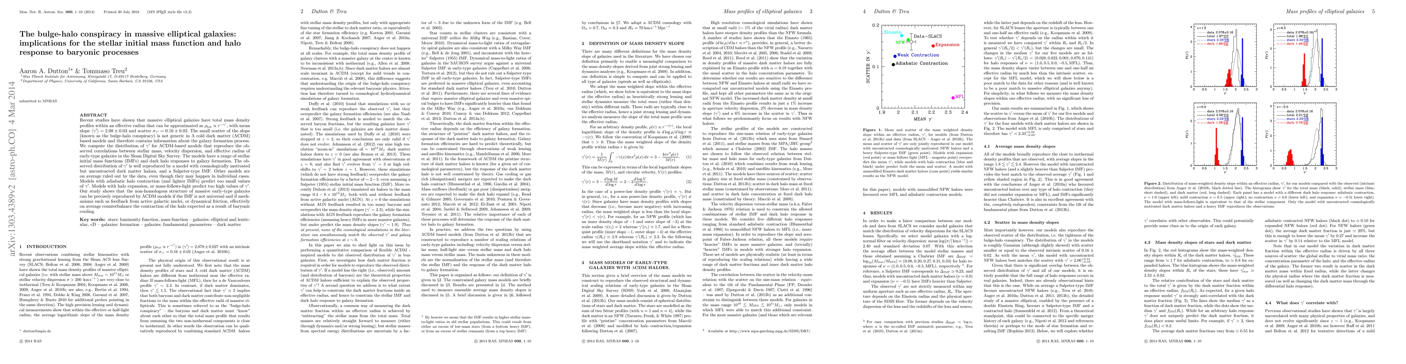 This paper investigates the "bulge-halo conspiracy" in massive elliptical galaxies, finding that the small scatter in mass density profiles suggests a specific galaxy formation process. The study shows that a Salpeter-type stellar initial mass function and cosmologically motivated dark matter haloes best reproduce observed correlations, ruling out models with adiabatic halo contraction or mass-follows-light.