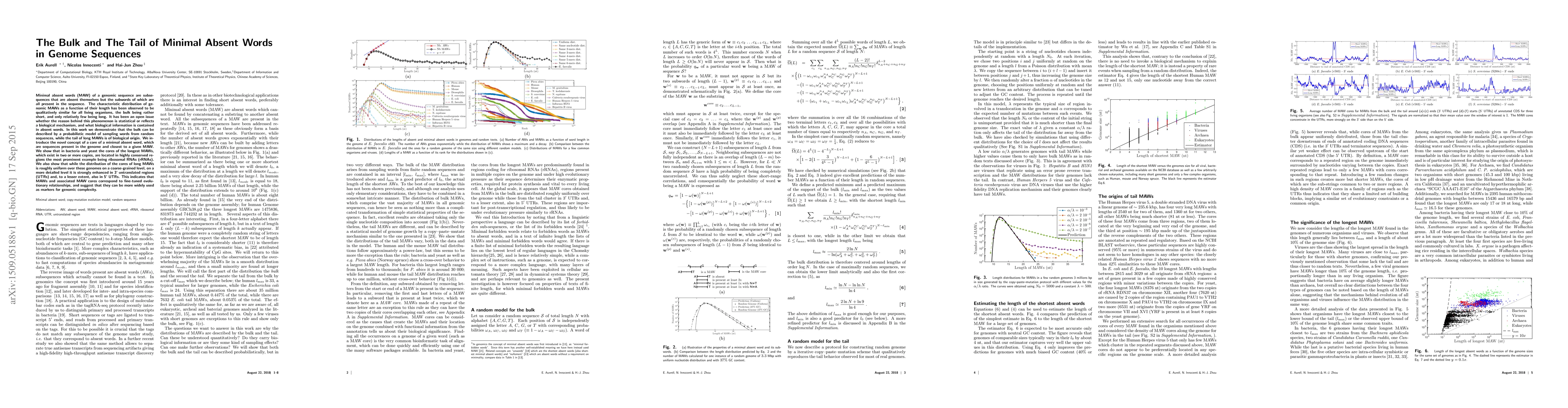 This paper investigates the distribution of minimal absent words (MAWs) in genome sequences, showing that while shorter MAWs follow a probabilistic model, longer MAWs are biologically significant, often found in highly conserved regions like ribosomal RNAs and enriched in untranslated regions, indicating their role in genomic complexity.