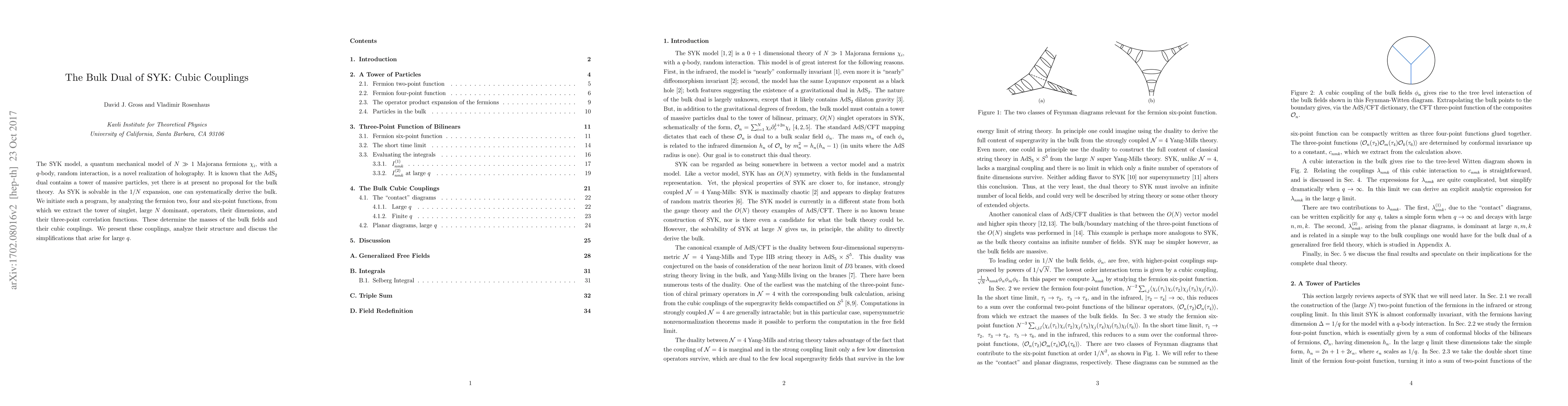 The SYK model, a quantum mechanical model of $N \gg 1$ Majorana fermions $\chi_i$, with a $q$-body, random interaction, is a novel realization of holography. It is known that the AdS$_2$ dual contains a tower of massive particles, yet there is at present no proposal for the bulk theory. As SYK is solvable in the $1/N$ expansion, one can systematically derive the bulk. We initiate such a program, by analyzing the fermion two, four and six-point functions, from which we extract the tower of singlet, large $N$ dominant, operators, their dimensions, and their three-point correlation functions. These determine the masses of the bulk fields and their cubic couplings. We present these couplings, analyze their structure and discuss the simplifications that arise for large $q$.