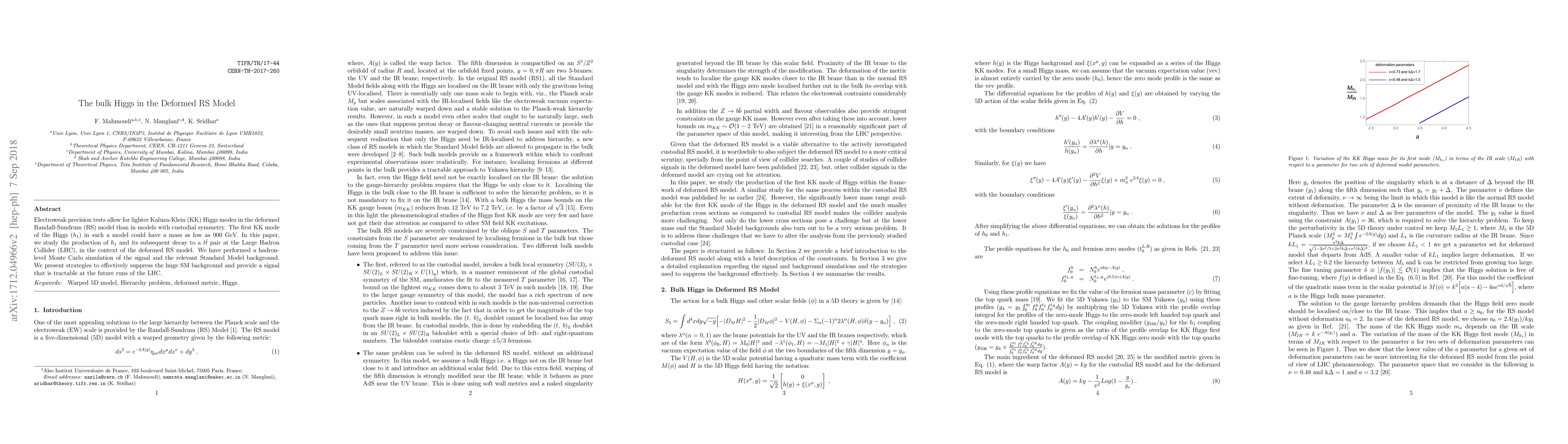The Randall-Sundrum model with a deformed metric can generate light Kaluza-Klein (KK) Higgs modes consistent with the electroweak precision analysis for a certain range of parameters. The first KK mode of the Higgs ($h_{1}$) in such a model could lie in the mass range varying from 800 GeV to 1.3 TeV. We find that the $h_{1}$ is gaugephobic and decays dominantly into a $t\bar{t}$ pair. The search strategy for $h_{1}$ decaying to $t\bar{t}$ at the Large Hadron Collider (LHC) in this low mass range has been studies. We have used substructure tools to suppress the large QCD background associated with this channel. We find that $h_{1}$ can be probed at the LHC.