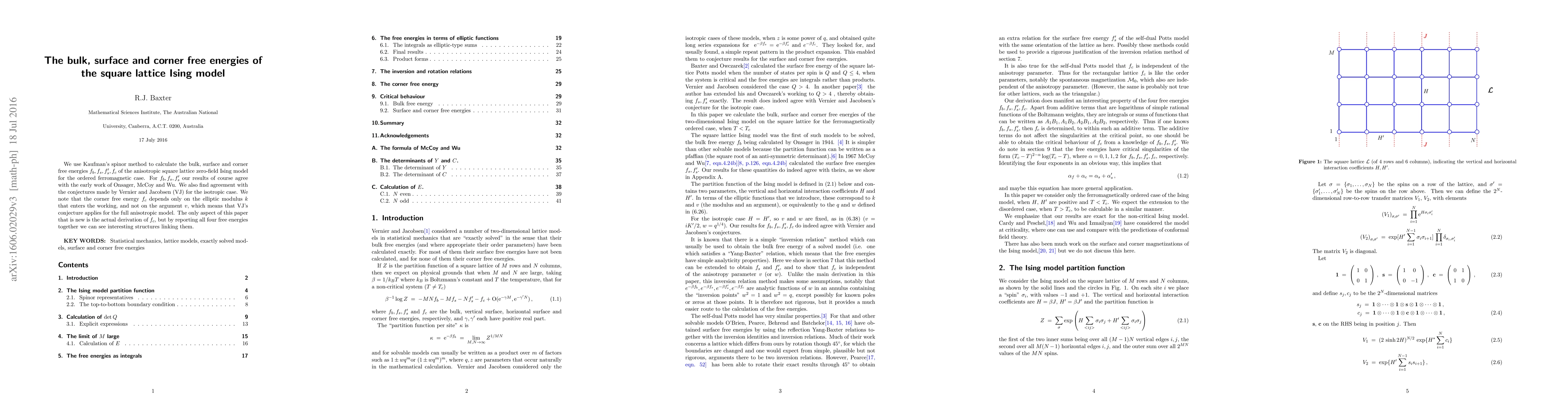 We use Kaufman's spinor method to calculate the bulk, surface and corner free energies $f_b, f_s, f_s', f_c$ of the anisotropic square lattice zero-field Ising model for the ordered ferromagnetic case. For $f_b, f_s, f'_s$ our results of course agree with the early work of Onsager, McCoy and Wu. We also find agreement with the conjectures made by Vernier and Jacobsen (VJ) for the isotropic case. We note that the corner free energy $f_c$ depends only on the elliptic modulus $k$ that enters the working, and not on the argument $v$, which means that VJ's conjecture applies for the full anisotropic model. The only aspect of this paper that is new is the actual derivation of $f_c$, but by reporting all four free energies together we can see interesting structures linking them.