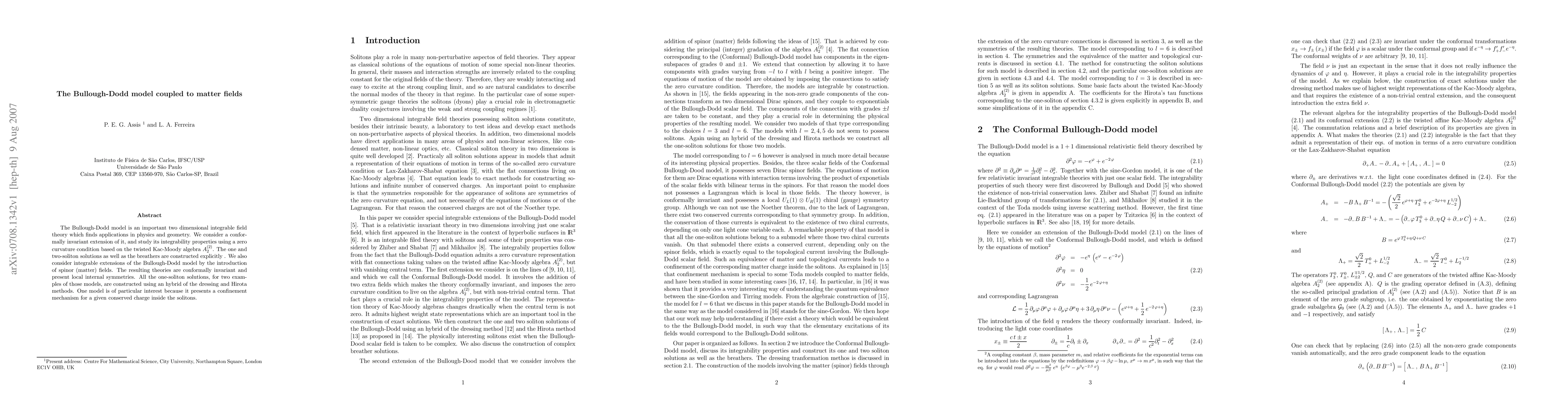 This paper extends the Bullough-Dodd model to include conformal invariance and matter fields, exploring its integrability via a zero curvature condition based on the twisted Kac-Moody algebra A_2^{(2)}. Explicit one and two-soliton solutions, breathers, and a novel confinement mechanism for a conserved charge within solitons are presented, using hybrid dressing and Hirota methods.