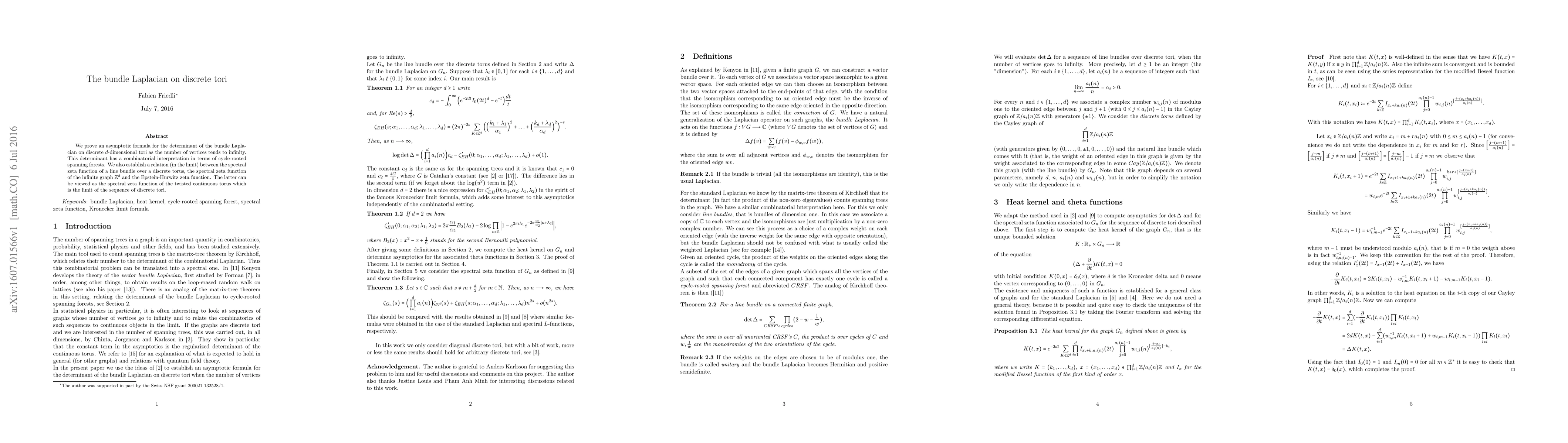 We prove an asymptotic formula for the determinant of the bundle Laplacian on discrete $d$-dimensional tori as the number of vertices tends to infinity. This determinant has a combinatorial interpretation in terms of cycle-rooted spanning forests. We also establish a relation (in the limit) between the spectral zeta function of a line bundle over a discrete torus, the spectral zeta function of the infinite graph $\mathbb{Z}^d$ and the Epstein-Hurwitz zeta function. The latter can be viewed as the spectral zeta function of the twisted continuous torus which is the limit of the sequence of discrete tori.