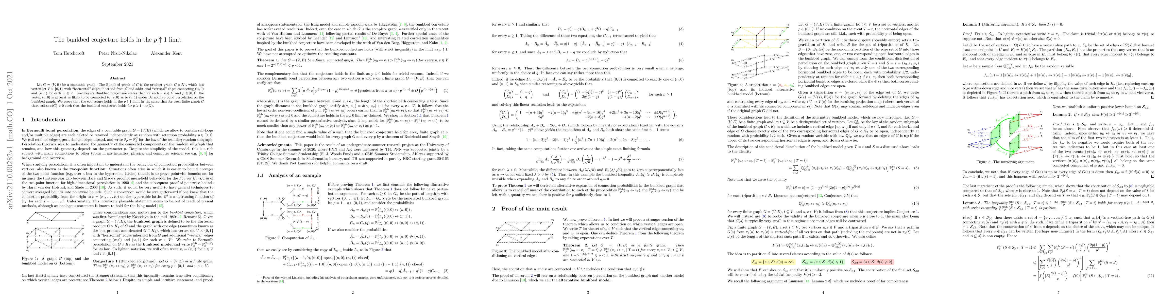 This paper proves Kasteleyn's bunkbed conjecture for the $p \uparrow 1$ limit, showing that in Bernoulli-$p$ bond percolation on bunkbed graphs, the vertex $(u,0)$ is more likely to connect to $(v,0)$ than $(v,1)$ for $p \geq 1-\varepsilon(G)$. The conjecture holds for all finite graphs $G$ with a sufficiently small $\varepsilon(G)$.