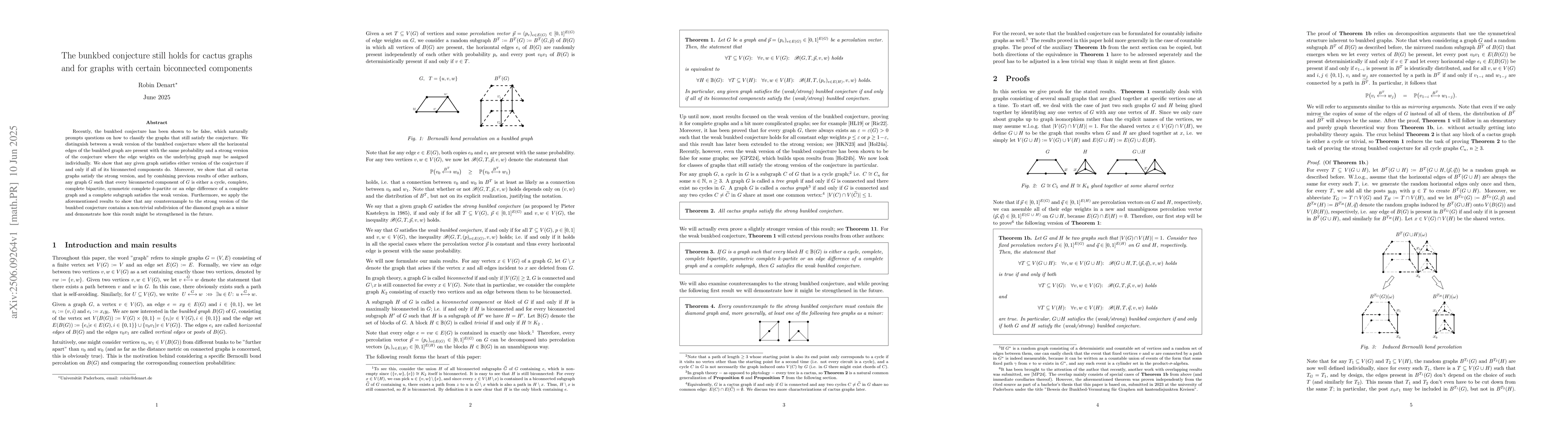 The paper explores the bunkbed conjecture, finding that a graph satisfies weaker or stronger versions if all biconnected components do. It confirms cactus graphs satisfy the strong version and identifies specific biconnected components (cycles, complete, complete bipartite, symmetric complete k-partite, or edge difference of complete graphs) that ensure weak version satisfaction. The research suggests any strong version counterexample includes a non-trivial subdivision of the diamond graph as a minor.