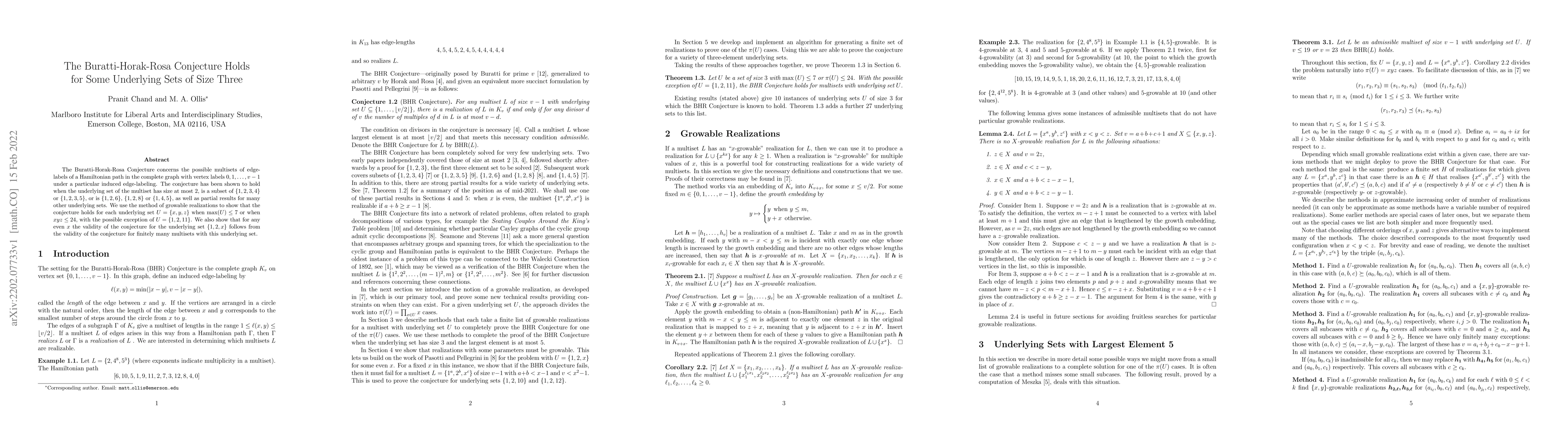 The Buratti-Horak-Rosa Conjecture concerns the possible multisets of edge-labels of a Hamiltonian path in the complete graph with vertex labels $0, 1, \ldots, {v-1}$ under a particular induced edge-labeling. The conjecture has been shown to hold when the underlying set of the multiset has size at most~2, is a subset of $\{1,2,3,4\}$ or $\{1,2,3,5\}$, or is $\{1,2,6\}$, $\{1,2,8\}$ or $\{1,4,5\}$, as well as partial results for many other underlying sets. We use the method of growable realizations to show that the conjecture holds for each underlying set $U = \{ x,y,z \}$ when $\max(U) \leq 7$ or when $xyz \leq 24$, with the possible exception of $U = \{1,2,11\}$. We also show that for any even $x$ the validity of the conjecture for the underlying set $\{ 1,2,x \}$ follows from the validity of the conjecture for finitely many multisets with this underlying set.