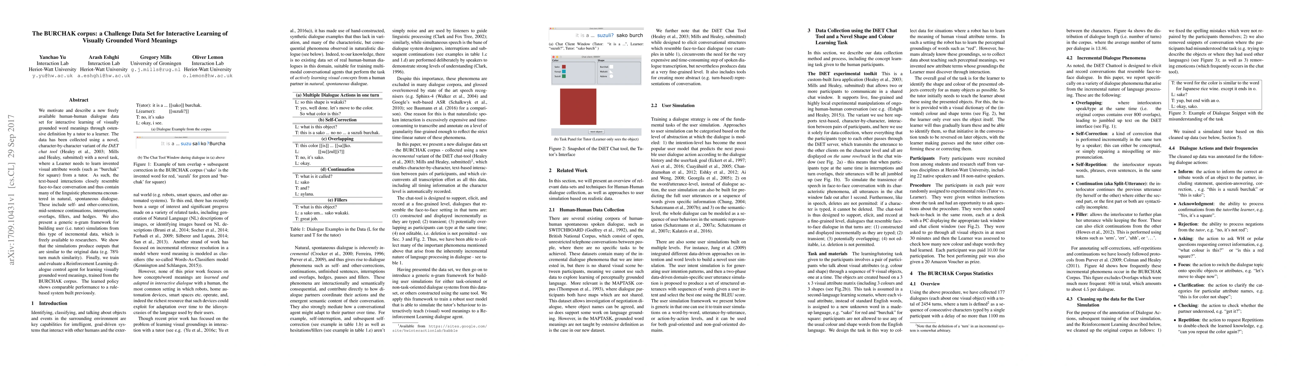 The BURCHAK corpus is a new dataset for interactive learning of visually grounded word meanings through human-human dialogue, collected using a novel chat tool. Researchers can use it to develop and evaluate dialogue control agents, with a Reinforcement Learning agent achieving comparable performance to a rule-based system.