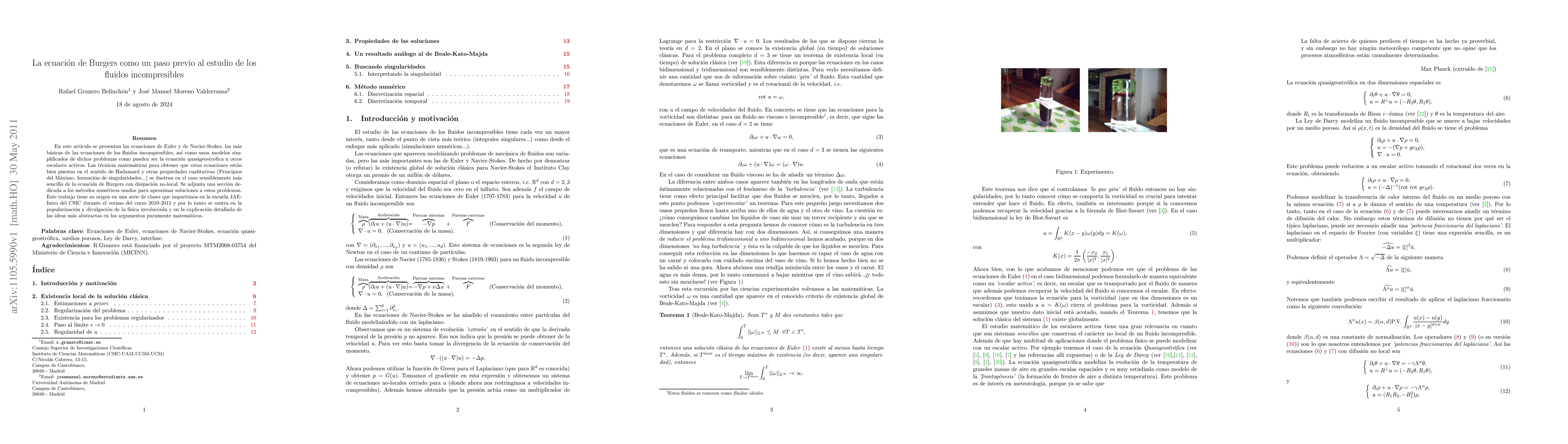 This lecture notes explore the Burgers equations as an introductory step to studying incompressible fluid dynamics, presenting mathematical techniques to prove existence and uniqueness, and explaining a useful numerical method for solving these equations. Aimed at the 2010 JAE-Intro Summer School in Madrid, organized by ICMAT-CSIC.