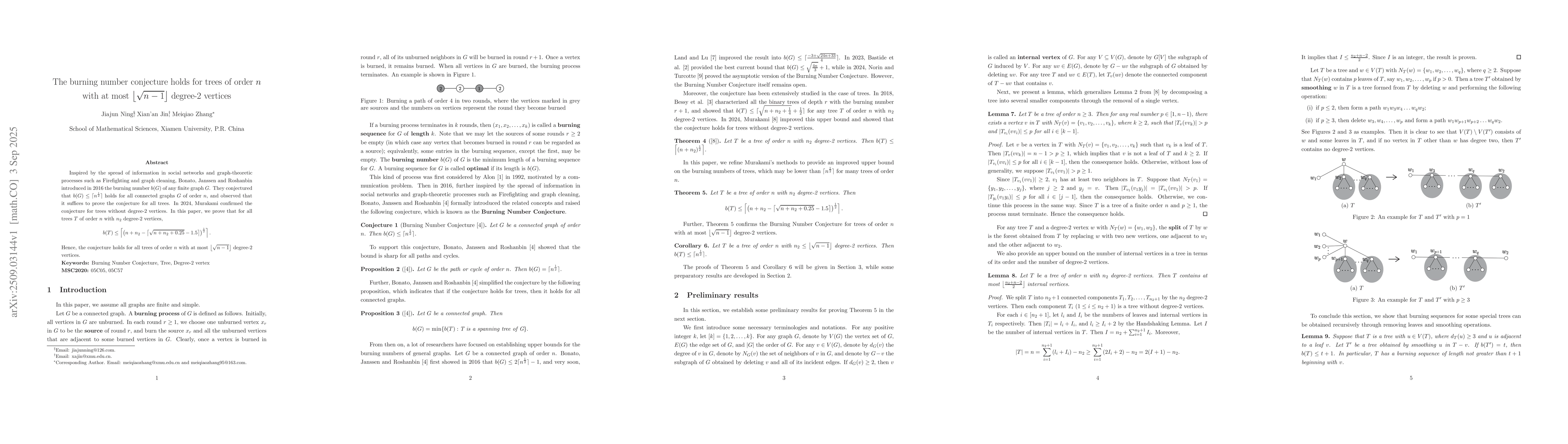 Inspired by the spread of information in social networks and graph-theoretic processes such as Firefighting and graph cleaning, Bonato, Janssen and Roshanbin introduced in 2016 the burning number $b(G)$ of any finite graph $G$. They conjectured that $b(G)\le \lceil n^\frac{1}{2}\rceil$ holds for all connected graphs $G$ of order $n$, and observed that it suffices to prove the conjecture for all trees. In 2024, Murakami confirmed the conjecture for trees without degree-2 vertices. In this paper, we prove that for all trees $T$ of order $n$ with $n_2$ degree-2 vertices, $$b(T)\le \left\lceil \left(n+n_2-\left\lceil\sqrt{n+n_2+0.25}-1.5\right\rceil\right)^{\frac{1}{2}}\right\rceil.$$ Hence, the conjecture holds for all trees of order $n$ with at most $\left\lfloor \sqrt{n-1}\right\rfloor$ degree-2 vertices.