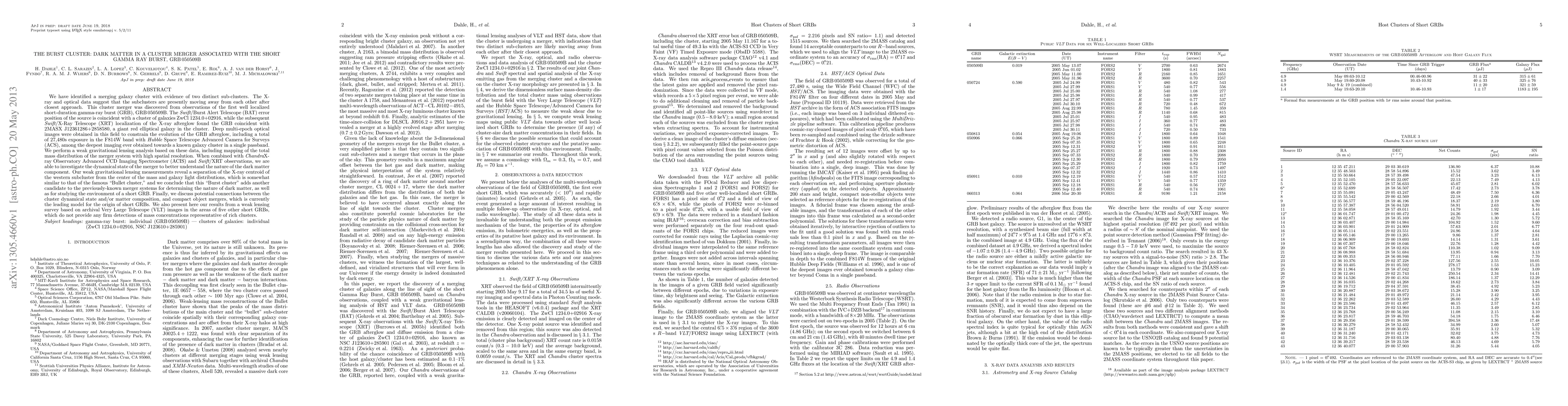 We have identified a merging galaxy cluster with evidence of two distinct sub-clusters. The X-ray and optical data suggest that the subclusters are moving away from each other after closest approach. This cluster merger was discovered from observations of the well localized short-duration gamma-ray burst (GRB), GRB 050509B. The Swift/Burst Alert Telescope (BAT) source position is coincident with a cluster of galaxies ZwCl 1234.0+02916. The subsequent Swift/X-Ray Telescope (XRT) localization of the X-ray afterglow found the GRB coincident with 2MASX J12361286+2858580, a giant red elliptical galaxy in the cluster. Deep multi-epoch optical images were obtained to constrain the evolution of the GRB afterglow, including a 27480s exposure in the F814W band with Hubble Space Telescope Advanced Camera for Surveys (ACS), among the deepest imaging ever obtained towards a known galaxy cluster in a single passband. We perform a weak gravitational lensing analysis, including mapping the total mass distribution of the merger system. Combined with Chandra X-ray Observatory and Swift/XRT observations, we investigate the dynamical state of the merger to probe the nature of the dark matter component. Our weak gravitational lensing measurements reveal a separation of the X-ray centroid of the western subcluster from the center of the mass and galaxy light distributions, similar to that of the famous "Bullet cluster". We conclude that the "Burst cluster" is another candidate merger system for determining the nature of dark matter and for studying the environment of short GRBs. We discuss connections between the cluster dynamical state and/or matter composition and compact object mergers, the leading model for the origin of short GRBs. Finally, we present results from a weak lensing survey based on archival Very Large Telescope (VLT) images in the areas of 5 other short GRBs.