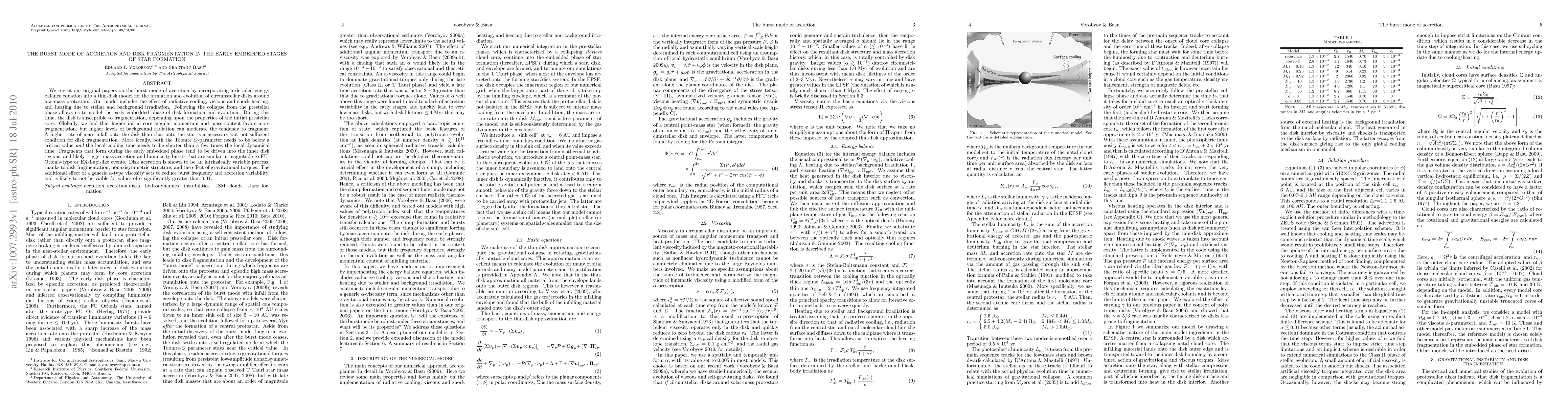 This paper models the burst mode of accretion and disk fragmentation in early embedded star formation stages, incorporating energy balance into a thin-disk model. The study finds that higher initial core angular momentum and mass promote fragmentation, while background radiation can mitigate it, and that disk fragmentation is driven by local conditions such as the Toomre Q-parameter and cooling times.