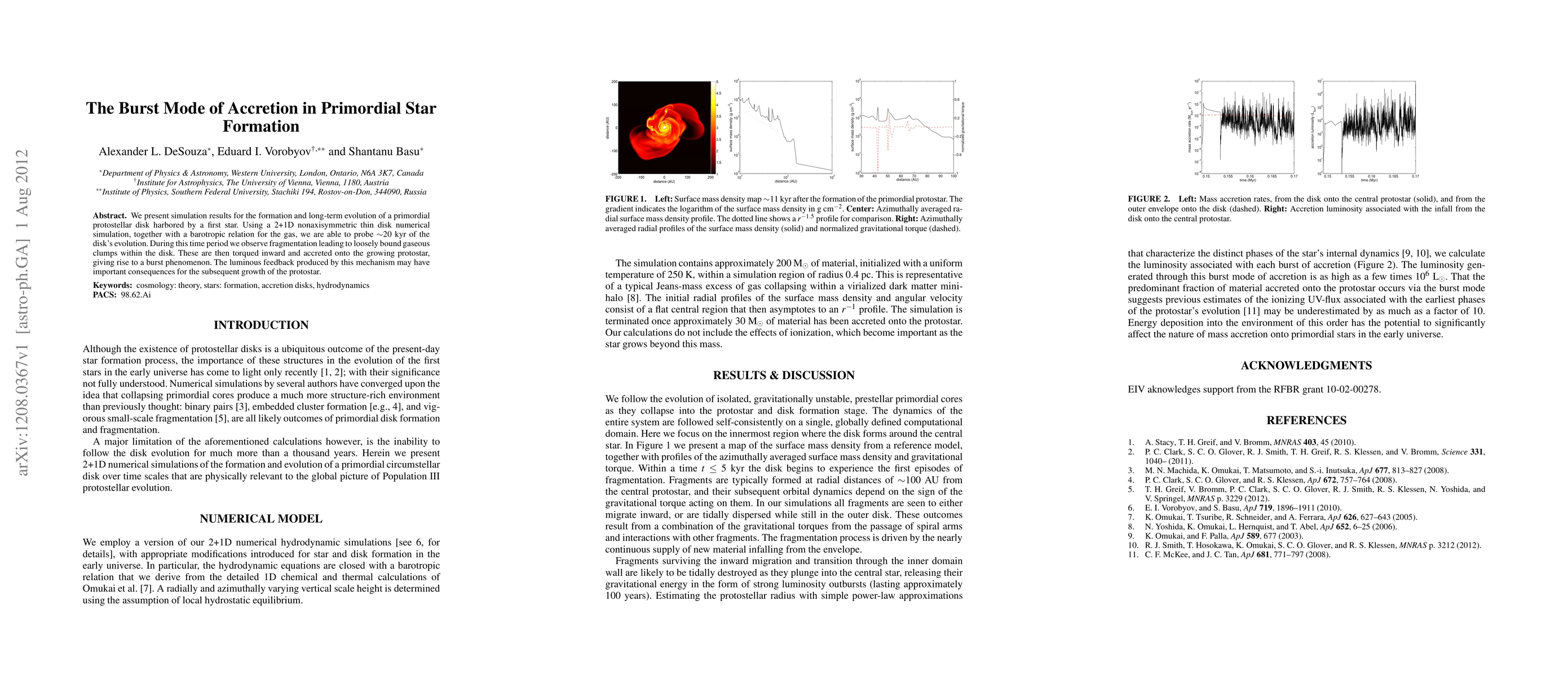 This paper uses 2+1D simulations to study the formation and evolution of primordial protostellar disks, revealing fragmentation leading to clumps that accrete in bursts onto the protostar, driven by luminous feedback that impacts the star's growth.
