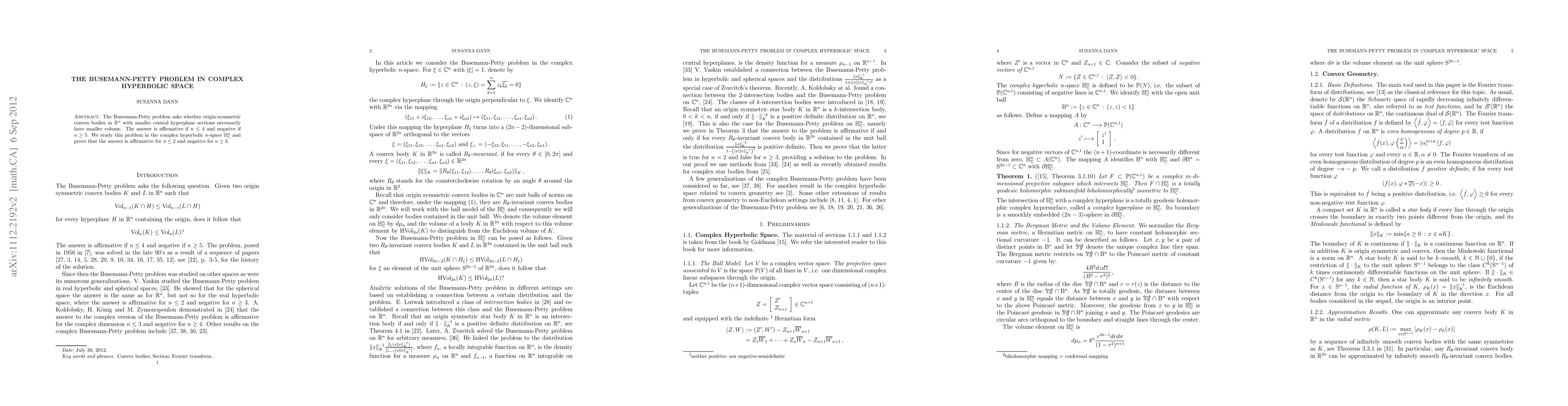 The Busemann-Petty problem in real Euclidean space is resolved for dimensions up to 4 but fails for higher dimensions. This study extends the problem to complex hyperbolic space, confirming its validity for dimensions up to 2 but refuting it for dimensions 3 and above.