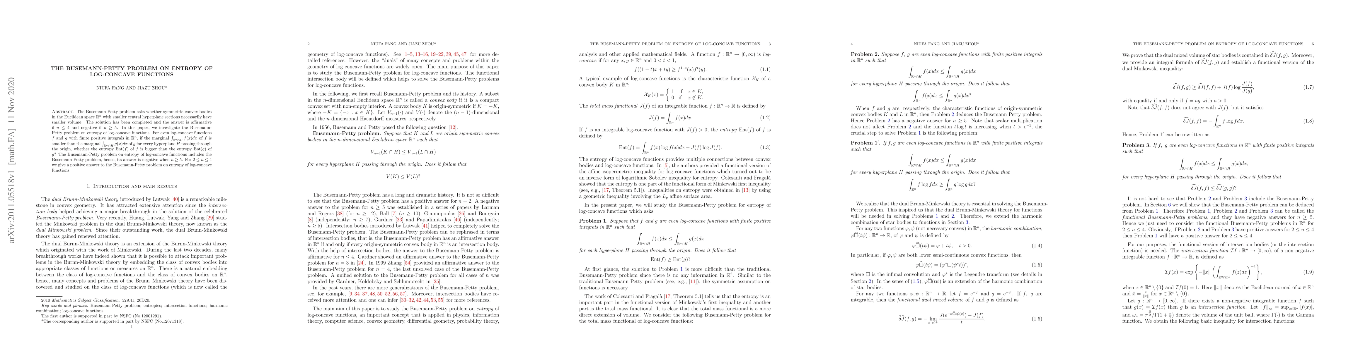 The paper investigates the Busemann-Petty problem for entropy of log-concave functions, extending the classical problem to the functional setting and proving the negative answer for dimensions n ≥ 5, while affirming the positive answer for 2 ≤ n ≤ 4.