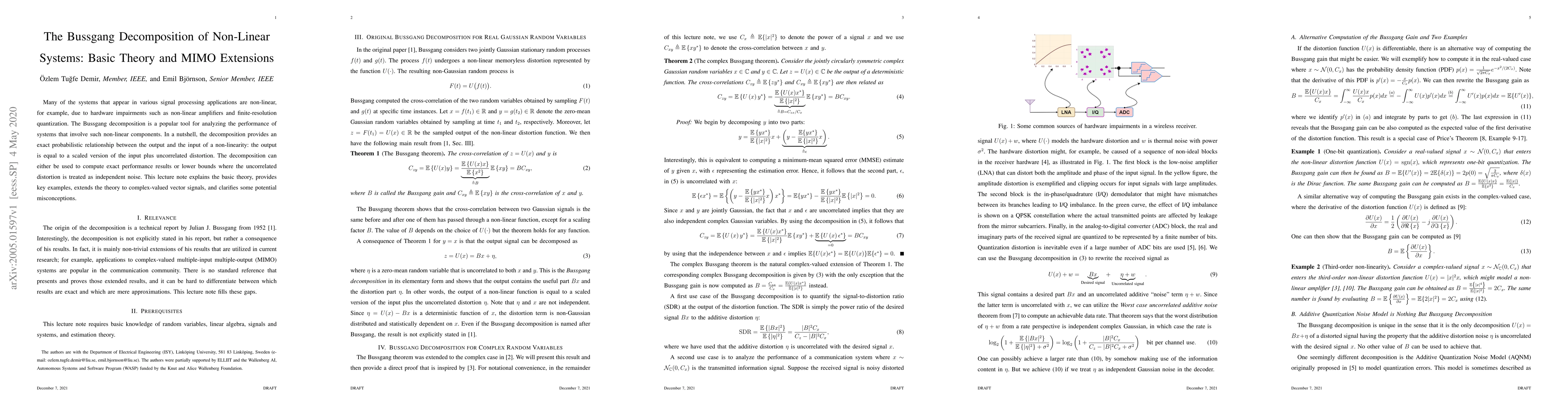 The Bussgang decomposition is a method for analyzing non-linear systems with hardware impairments, providing an exact probabilistic relationship between input and output. It offers performance computation or noise-treating lower bounds, extended to complex-valued vector signals, with clarifications on common misconceptions.