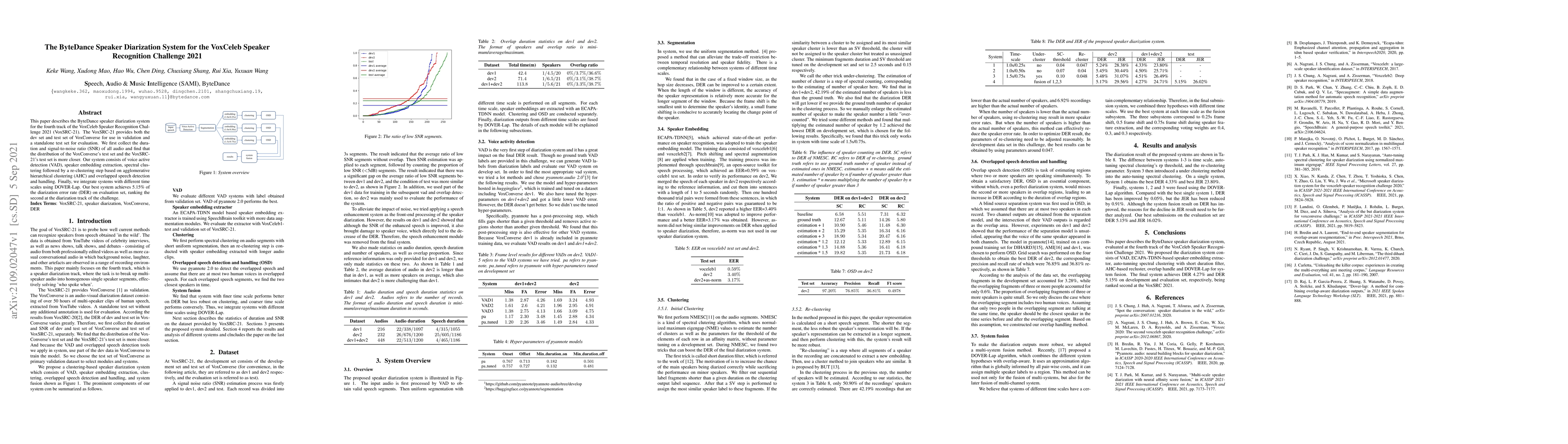 This paper describes the ByteDance speaker diarization system for the fourth track of the VoxCeleb Speaker Recognition Challenge 2021 (VoxSRC-21). The VoxSRC-21 provides both the dev set and test set of VoxConverse for use in validation and a standalone test set for evaluation. We first collect the duration and signal-to-noise ratio (SNR) of all audio and find that the distribution of the VoxConverse's test set and the VoxSRC-21's test set is more closer. Our system consists of voice active detection (VAD), speaker embedding extraction, spectral clustering followed by a re-clustering step based on agglomerative hierarchical clustering (AHC) and overlapped speech detection and handling. Finally, we integrate systems with different time scales using DOVER-Lap. Our best system achieves 5.15\% of the diarization error rate (DER) on evaluation set, ranking the second at the diarization track of the challenge.