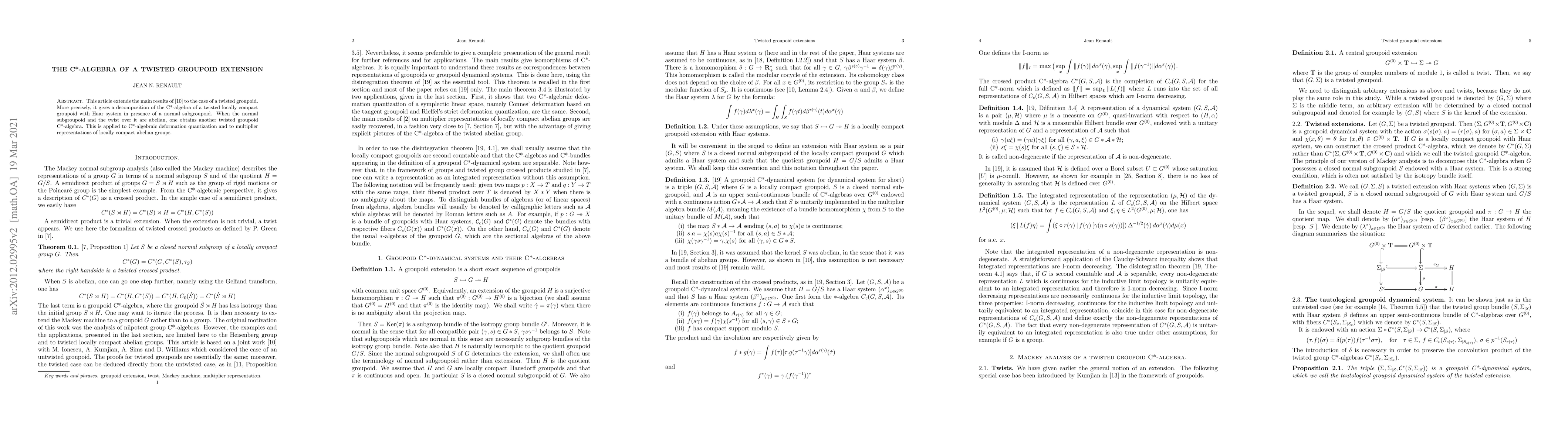 This paper extends previous results on C*-algebras to twisted groupoid extensions, providing a decomposition for such algebras when a normal subgroupoid and its twist are abelian. Applications include C*-algebraic deformation quantization and multiplier representations of locally compact abelian groups.