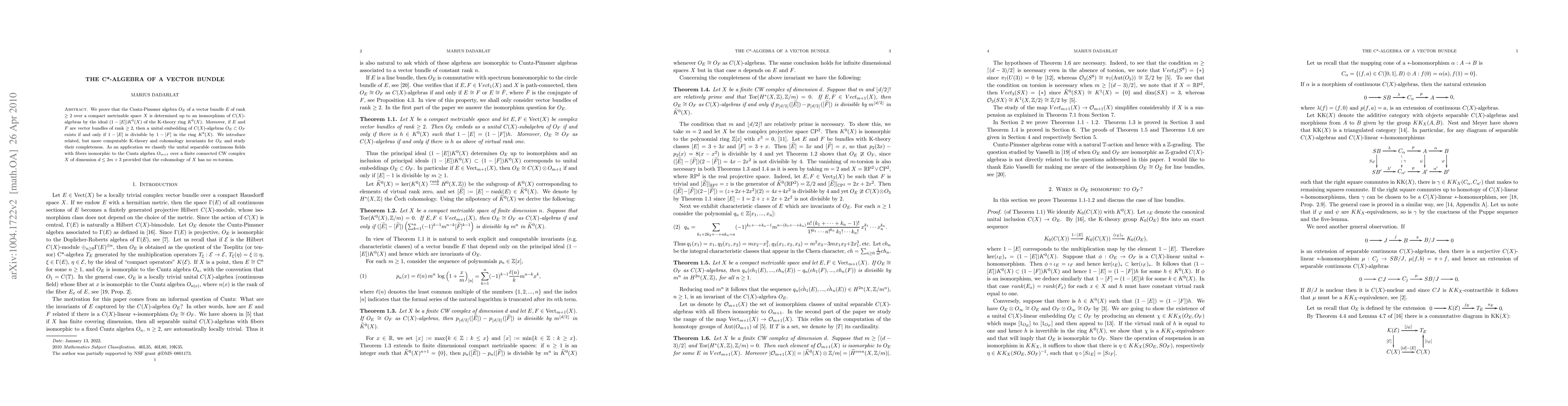 We prove that the Cuntz-Pimsner algebra O(E) of a vector bundle E over a compact metrizable space X is determined up to an isomorphism of C(X)-algebras by the ideal (1-[E])K(X) of the K-theory ring K(X). Moreover, if E and F are vector bundles of rank >1, then a unital embedding of C(X)-algebras of O(E) into O(F) exists if and only if 1-[E] is divisible by 1-[F] in the ring K(X). We introduce related, but more computable K-theory and cohomology invariants for O(E) and study their completeness. As an application we classify the unital separable continuous fields with fibers isomorphic to the Cuntz algebra O(m+1) over a finite connected CW complex X of dimension d< 2m+4 provided that the cohomology of X has no m-torsion.