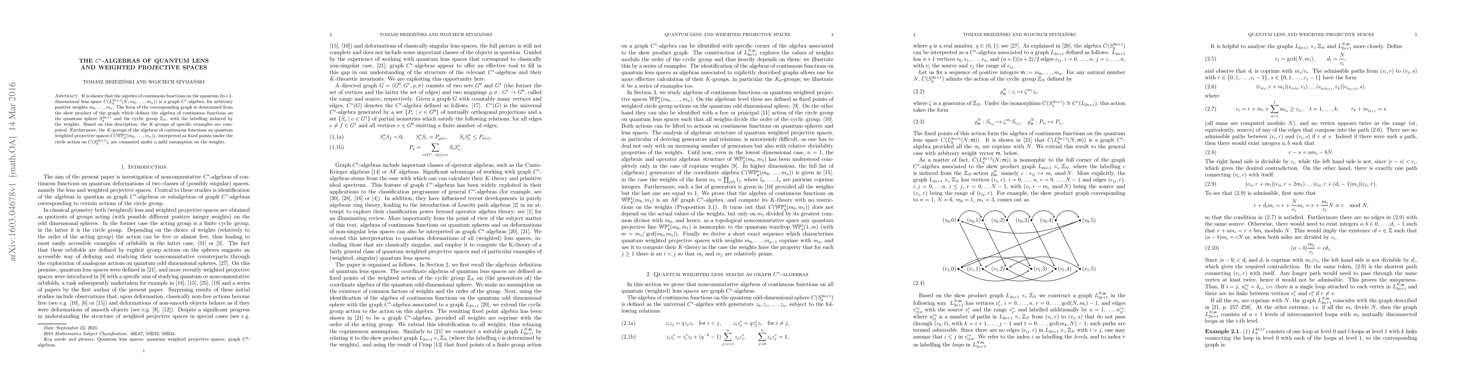 This paper demonstrates that the algebra of continuous functions on a quantum lens space is a graph $C^*$-algebra, derived from the skew product of the quantum sphere algebra and the cyclic group $\mathbb{Z}_N$. It computes the K-groups for these algebras and for quantum weighted projective spaces, under certain weight assumptions.