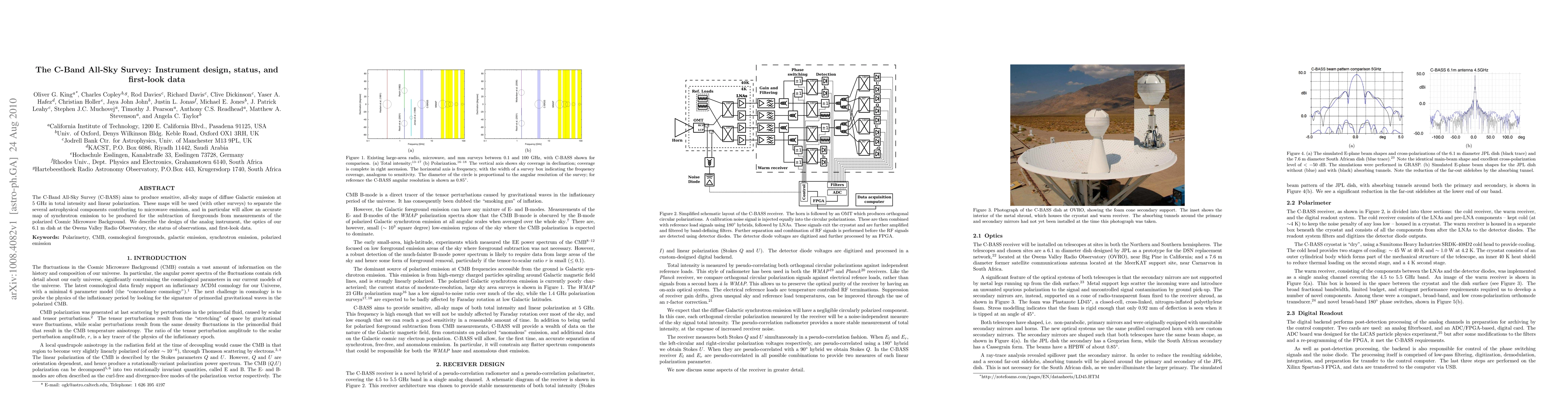 The C-Band All-Sky Survey (C-BASS) aims to produce sensitive, all-sky maps of diffuse Galactic emission at 5 GHz in total intensity and linear polarization. These maps will be used (with other surveys) to separate the several astrophysical components contributing to microwave emission, and in particular will allow an accurate map of synchrotron emission to be produced for the subtraction of foregrounds from measurements of the polarized Cosmic Microwave Background. We describe the design of the analog instrument, the optics of our 6.1 m dish at the Owens Valley Radio Observatory, the status of observations, and first-look data.