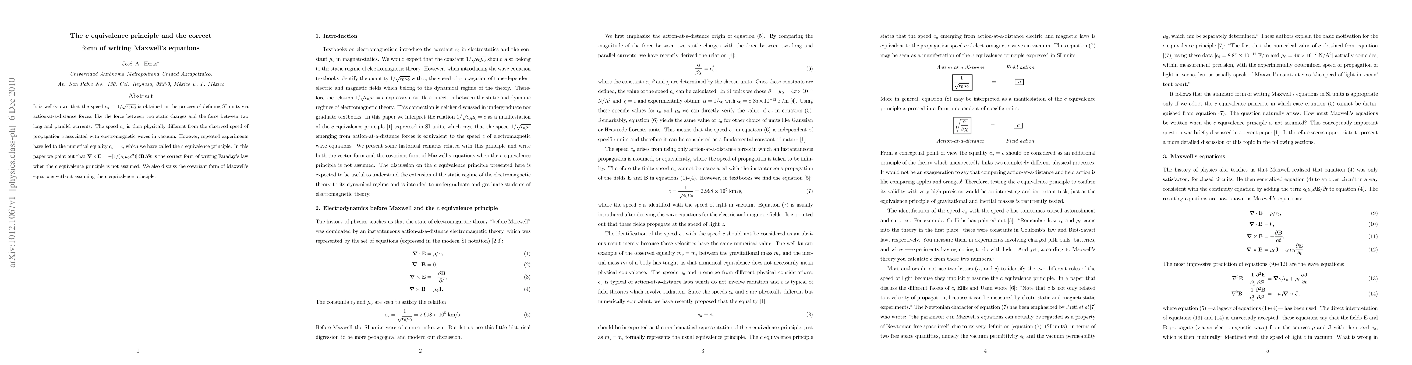 It is well-known that the speed $c_u=1/\sqrt{\epsilon_0\mu_0}$ is obtained in the process of defining SI units via action-at-a-distance forces, like the force between two static charges and the force between two long and parallel currents. The speed $c_u$ is then physically different from the observed speed of propagation $c$ associated with electromagnetic waves in vacuum. However, repeated experiments have led to the numerical equality $c_u=c,$ which we have called the $c$ equivalence principle. In this paper we point out that $\nabla\times{\bf E}=-[1/(\epsilon_0\mu_0 c^2)]\partial{\bf B}/\partial t$ is the correct form of writing Faraday's law when the $c$ equivalence principle is not assumed. We also discuss the covariant form of Maxwell's equations without assuming the $c$ equivalence principle.