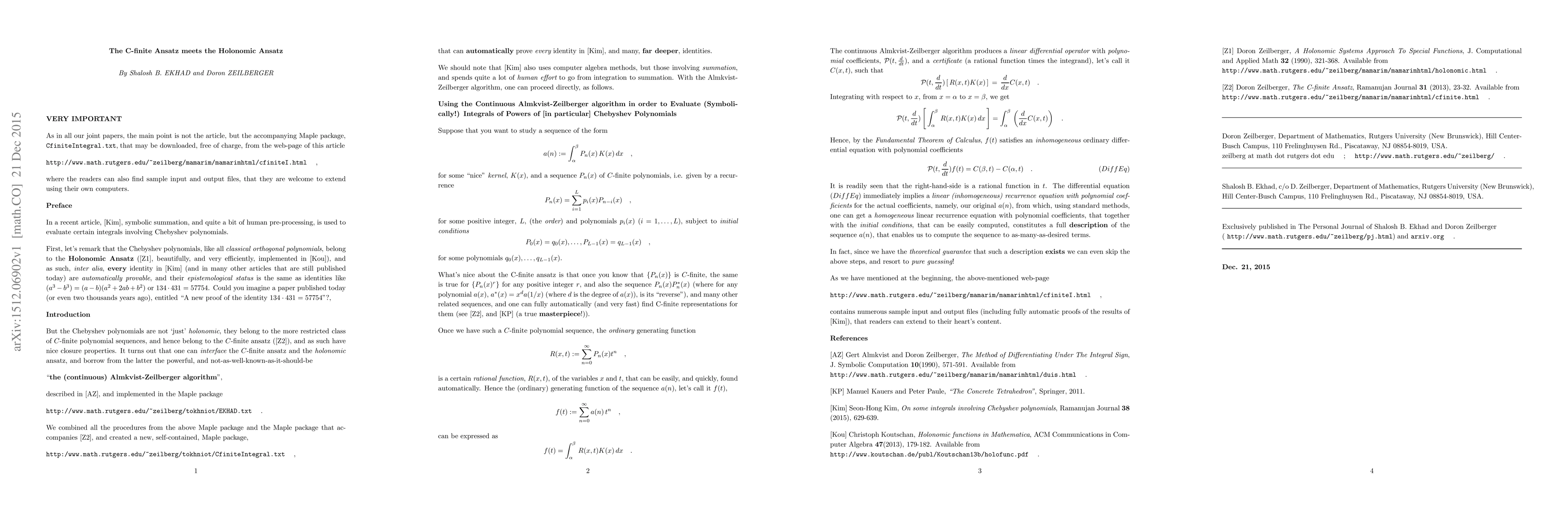 We show how the continuous Almkvist-Zeilberger algorithm can be used to efficiently discover and prove differential equations satisfied by generating functions of sequences defined as integrals of powers of C-finite polynomial sequences (like the Chebyshev polynomials) from which one can automatically derive linear recurrences with polynomial coefficients for the sequences themselves. We fully implement this with a Maple package, CfiniteIntergal.txt .