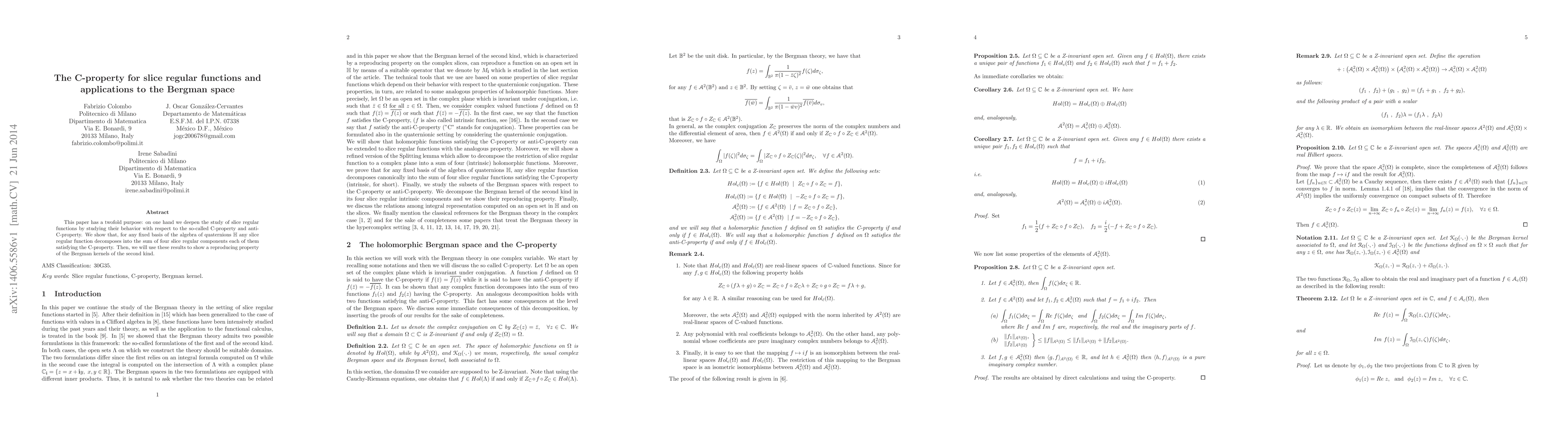 This paper explores the C-property of slice regular functions, demonstrating that any such function can be decomposed into four components, each satisfying the C-property. The findings are applied to establish a reproducing property of Bergman kernels of the second kind.