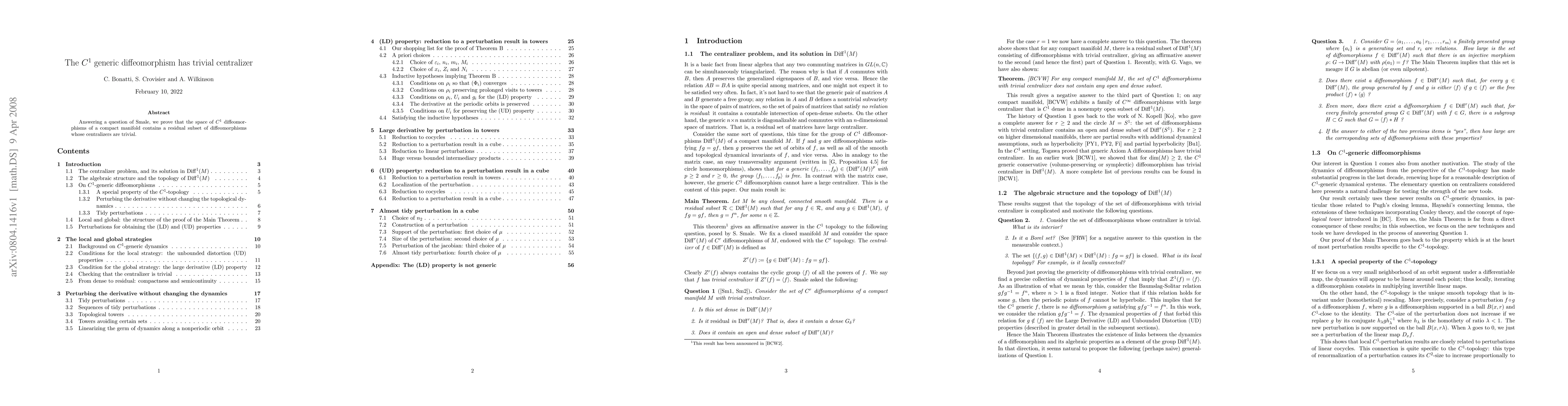 Summary: This paper answers Smale's question by demonstrating that within the space of C1 diffeomorphisms of a compact manifold, there exists a residual subset where each diffeomorphism has a trivial centralizer. This implies that most such diffeomorphisms do not share any non-trivial symmetries.