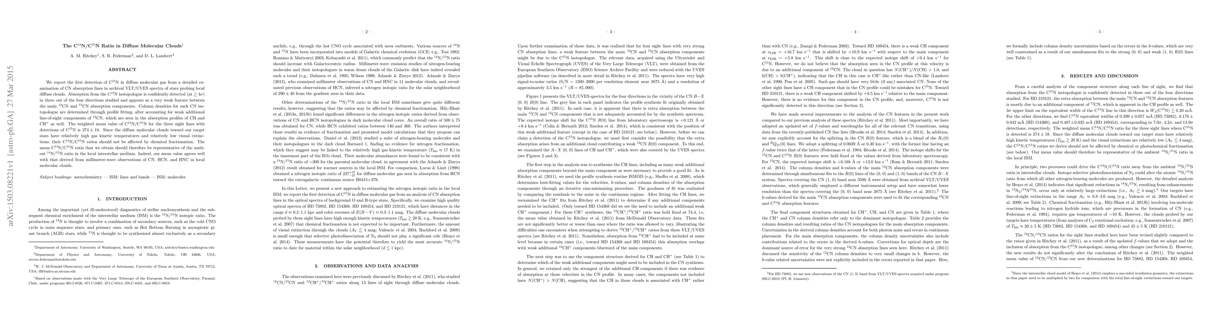This paper reports the first detection of C$^{15}$N in diffuse molecular clouds using VLT/UVES spectra, finding a weighted mean C$^{14}$N/C$^{15}$N ratio of $274\pm18$. The study suggests this ratio reflects the ambient $^{14}$N/$^{15}$N ratio in the local interstellar medium, aligning with values derived from millimeter-wave observations.