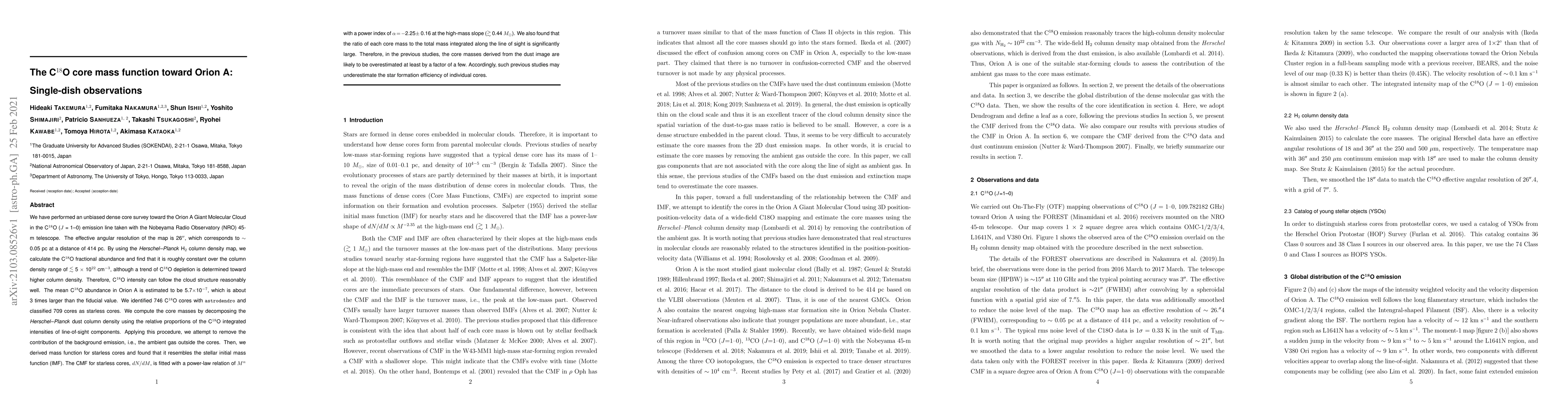 We have performed an unbiased dense core survey toward the Orion A Giant Molecular Cloud in the C$^{18}$O ($J$=1--0) emission line taken with the Nobeyama Radio Observatory (NRO) 45-m telescope. The effective angular resolution of the map is 26", which corresponds to $\sim$ 0.05 pc at a distance of 414 pc. By using the Herschel-Planck H$_2$ column density map, we calculate the C$^{18}$O fractional abundance and find that it is roughly constant over the column density range of $\lesssim$ 5 $\times$ 10$^{22}$ cm$^{-3}$, although a trend of C$^{18}$O depletion is determined toward higher column density. Therefore, C$^{18}$O intensity can follow the cloud structure reasonably well. The mean C$^{18}$O abundance in Orion A is estimated to be 5.7$\times$10$^{-7}$, which is about 3 times larger than the fiducial value. We identified 746 C$^{18}$O cores with astrodendro and classified 709 cores as starless cores. We compute the core masses by decomposing the Herschel-Planck dust column density using the relative proportions of the C$^{18}$O integrated intensities of line-of-sight components. Applying this procedure, we attempt to remove the contribution of the background emission, i.e., the ambient gas outside the cores. Then, we derived mass function for starless cores and found that it resembles the stellar initial mass function (IMF). The CMF for starless cores, $dN/dM$, is fitted with a power-law relation of $M^\alpha$ with a power index of $\alpha = -$2.25$\pm$ 0.16 at the high-mass slope ($\gtrsim$ 0.44 $M_\odot$). We also found that the ratio of each core mass to the total mass integrated along the line of sight is significantly large. Therefore, in the previous studies, the core masses derived from the dust image are likely to be overestimated at least by a factor of a few. Accordingly, such previous studies may underestimate the star formation efficiency of individual cores.