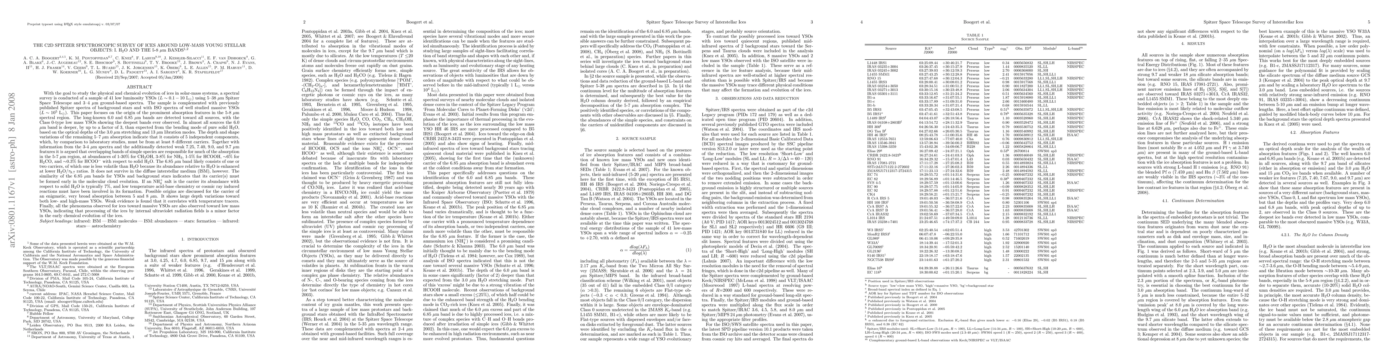 With the goal to study the physical and chemical evolution of ices in solar-mass systems, a spectral survey is conducted of a sample of 41 low luminosity YSOs using 3-38 um Spitzer and ground-based spectra. The long-known 6.0 and 6.85 um bands are detected toward all sources, with the Class 0-type YSOs showing the deepest bands ever observed. In almost all sources the 6.0 um band is deeper than expected from the bending mode of pure solid H2O. The depth and shape variations of the remaining 5-7 um absorption indicate that it consists of 5 independent components, which, by comparison to laboratory studies, must be from at least 8 different carriers. Simple species are responsible for much of the absorption in the 5-7 um region, at abundances of 1-30% for CH3OH, 3-8% for NH3, 1-5% for HCOOH, ~6% for H2CO, and ~0.3% for HCOO- with respect to solid H2O. The 6.85 um band likely consists of one or two carriers, of which one is less volatile than H2O because its abundance relative to H2O is enhanced at lower H2O/tau_9.7 ratios. It does not survive in the diffuse interstellar medium (ISM), however. The similarity of the 6.85 um bands for YSOs and background stars indicates that its carrier(s) must be formed early in the molecular cloud evolution. If an NH4+ salt is the carrier its abundance with respect to solid H2O is typically 7%, and low temperature acid-base chemistry or cosmic ray induced reactions must have been involved in its formation. Possible origins are discussed for the carrier of an enigmatic, very broad absorption between 5 and 8 um. Finally, all the phenomena observed for ices toward massive YSOs are also observed toward low mass YSOs, indicating that processing of the ices by internal ultraviolet radiation fields is a minor factor in the early chemical evolution of the ices. [abridged]