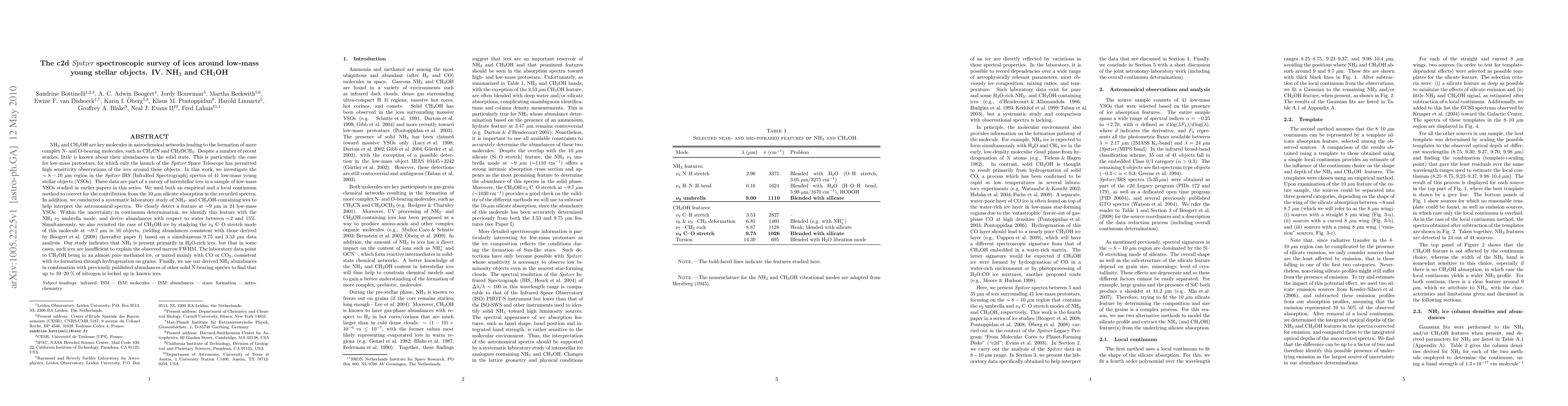 NH3 and CH3OH are key molecules in astrochemical networks leading to the formation of more complex N- and O-bearing molecules, such as CH3CN and HCOOCH3. Despite a number of recent studies, little is known about their abundances in the solid state. (...) In this work, we investigate the ~ 8-10 micron region in the Spitzer IRS (InfraRed Spectrograph) spectra of 41 low-mass young stellar objects (YSOs). These data are part of a survey of interstellar ices in a sample of low-mass YSOs studied in earlier papers in this series. We used both an empirical and a local continuum method to correct for the contribution from the 10 micron silicate absorption in the recorded spectra. In addition, we conducted a systematic laboratory study of NH3- and CH3OH-containing ices to help interpret the astronomical spectra. We clearly detect a feature at ~9 micron in 24 low-mass YSOs. Within the uncertainty in continuum determination, we identify this feature with the NH3 nu_2 umbrella mode, and derive abundances with respect to water between ~2 and 15%. Simultaneously, we also revisited the case of CH3OH ice by studying the nu_4 C-O stretch mode of this molecule at ~9.7 micron in 16 objects, yielding abundances consistent with those derived by Boogert et al. 2008 (hereafter paper I) based on a simultaneous 9.75 and 3.53 micron data analysis. Our study indicates that NH3 is present primarily in H2O-rich ices, but that in some cases, such ices are insufficient to explain the observed narrow FWHM. The laboratory data point to CH3OH being in an almost pure methanol ice, or mixed mainly with CO or CO2, consistent with its formation through hydrogenation on grains. Finally, we use our derived NH3 abundances in combination with previously published abundances of other solid N-bearing species to find that up to 10-20 % of nitrogen is locked up in known ices.