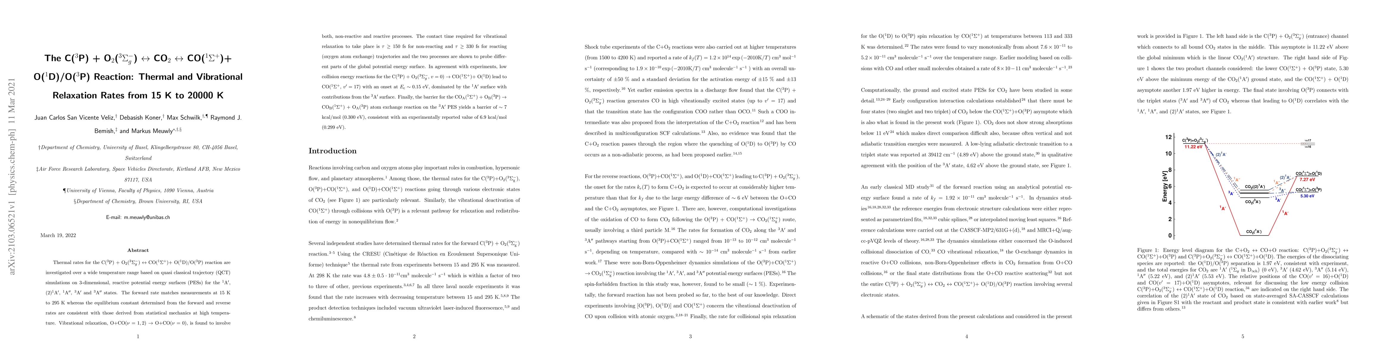 Thermal rates for the C($^3$P) + O$_2$($^3 \Sigma_g^-$) $\leftrightarrow$ CO($^1 \Sigma^+$)+ O($^1$D)/O($^3$P) reaction are investigated over a wide temperature range based on quasi classical trajectory (QCT) simulations on 3-dimensional, reactive potential energy surfaces (PESs) for the $^1$A$'$, $(2)^1$A$'$, $^1$A$''$, $^3$A$'$ and $^3$A$''$ states. The forward rate matches measurements at 15 K to 295 K whereas the equilibrium constant determined from the forward and reverse rates are consistent with those derived from statistical mechanics at high temperature. Vibrational relaxation, O+CO($\nu=1, 2$) $\rightarrow$ O+CO$(\nu=0)$, is found to involve both, non-reactive and reactive processes. The contact time required for vibrational relaxation to take place is $\tau \geq 150$ fs for non-reacting and $\tau \geq 330$ fs for reacting (oxygen atom exchange) trajectories and the two processes are shown to probe different parts of the global potential energy surface. In agreement with experiments, low collision energy reactions for the C($^3$P) + O$_2$($^3 \Sigma_g^-$, $v=0$) $\rightarrow$ CO($^1 \Sigma^+$)+ O($^1$D) lead to CO($^{1}\Sigma^{+}$, $v'=17$) with an onset at $E_{\rm c} \sim 0.15$ eV, dominated by the $^1$A$'$ surface with contributions from the $^3$A$'$ surface. Finally, the barrier for the CO$_{\rm A}$($^1\Sigma^+$) + O$_{\rm B}$($^3$P) $\rightarrow$ CO$_{\rm B}$($^{1}\Sigma^{+}$) + O$_{\rm A}$($^3$P) atom exchange reaction on the $^3$A$'$ PES yields a barrier of $\sim 7$ kcal/mol (0.300 eV), consistent with an experimentally reported value of 6.9 kcal/mol (0.299 eV).