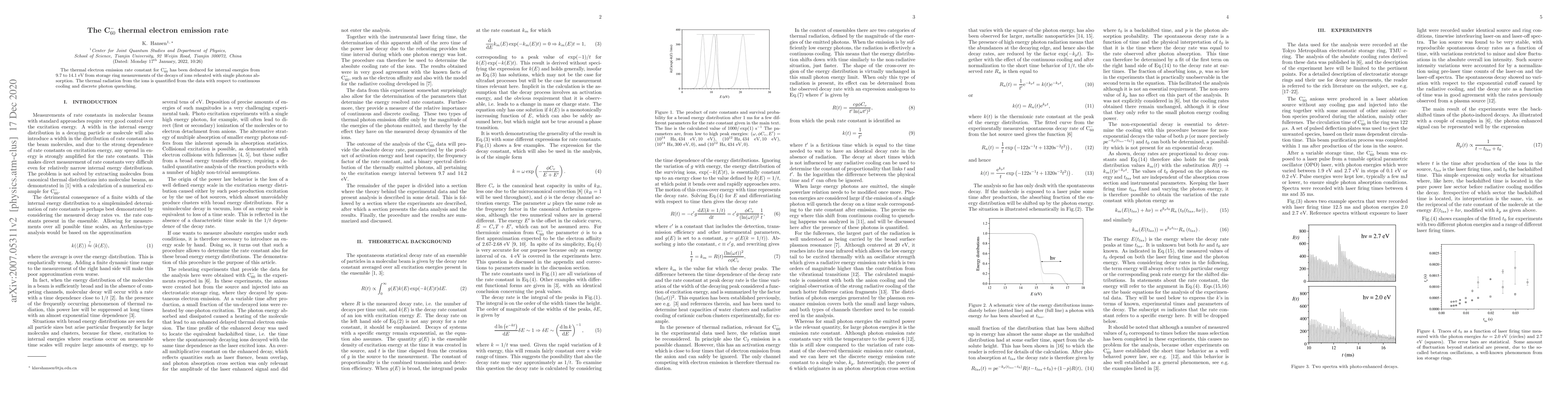 The thermal electron emission rate constant for C$_{60}^-$ has been deduced over a range of 4 eV internal energy from storage ring measurements of the decays of ions reheated with single photons absorption. The thermal radiation from the ions is quantified with respect to continuous cooling and discrete photon quenching.