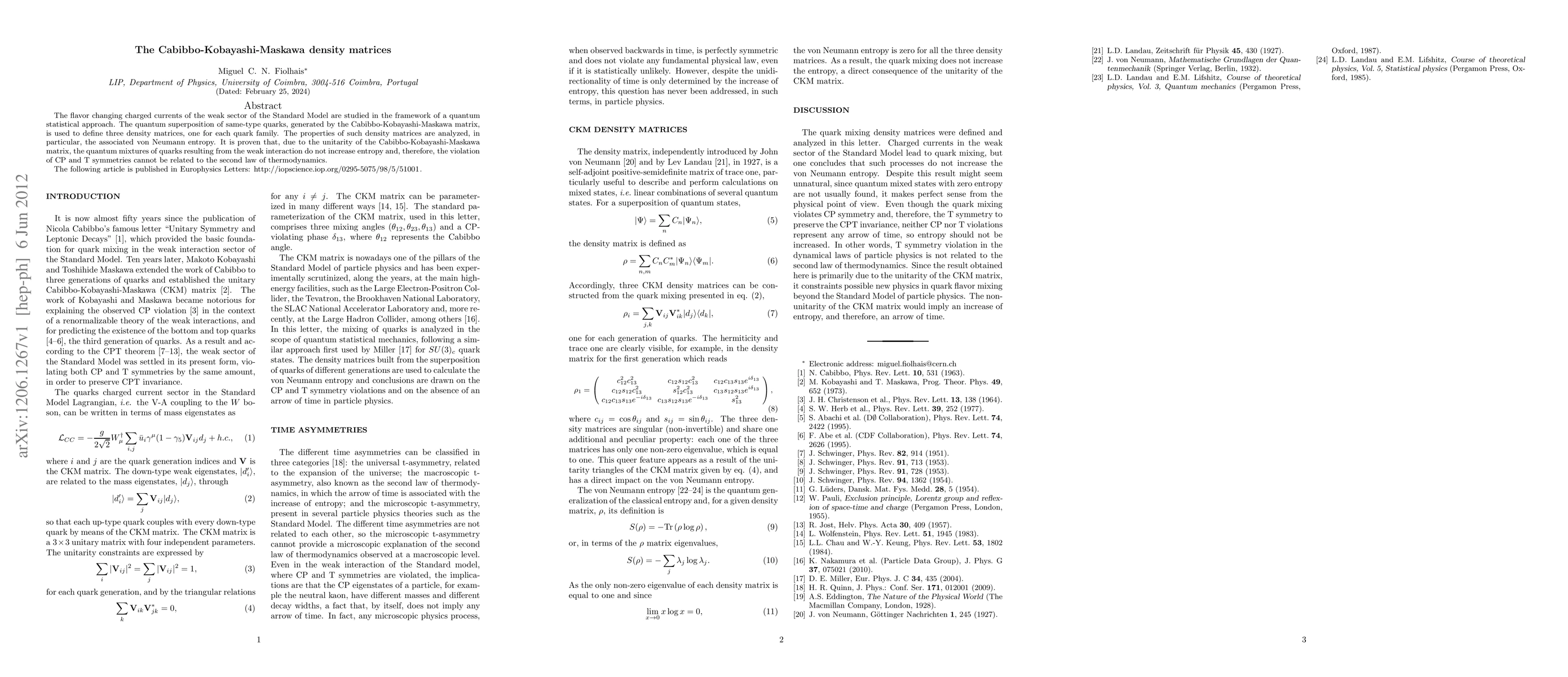 This paper investigates the flavor-changing charged currents in the Standard Model through a quantum statistical lens, defining density matrices for each quark family based on the Cabibbo-Kobayashi-Maskawa matrix. It concludes that the unitarity of this matrix ensures the quantum mixtures of quarks do not increase entropy, thereby demonstrating that CP and T symmetry violations cannot be linked to thermodynamic entropy increase.