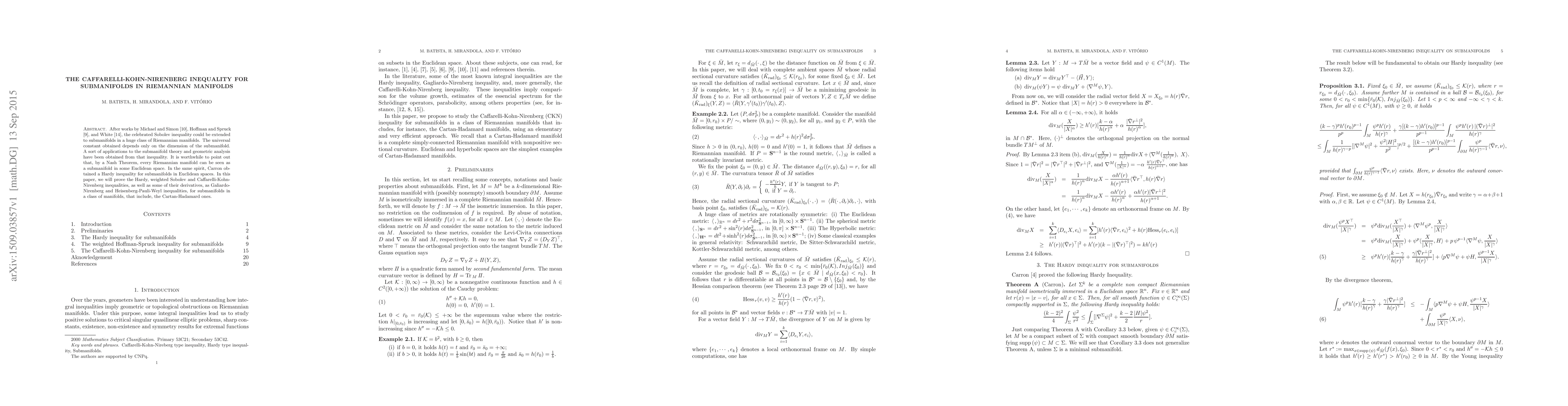 This paper extends the Caffarelli-Kohn-Nirenberg inequality to submanifolds in a broad class of Riemannian manifolds, including Cartan-Hadamard ones. The universal constants depend solely on the dimension of the submanifold, providing applications in geometric analysis and submanifold theory.
