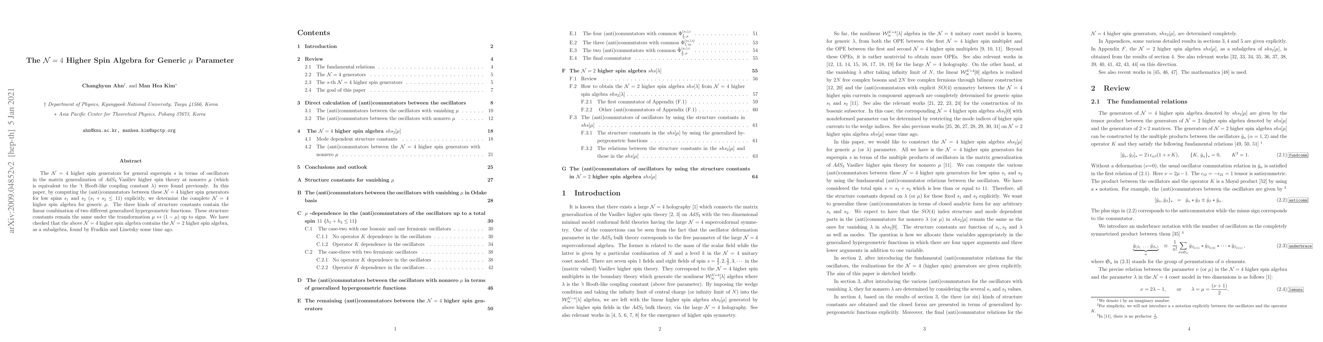 This paper determines the complete ${\cal N}=4$ higher spin algebra for generic $\mu$ by computing (anti)commutators of low spin generators, revealing structure constants expressed in terms of generalized hypergeometric functions. The algebra retains symmetry under $\mu \leftrightarrow (1-\mu)$ transformation.