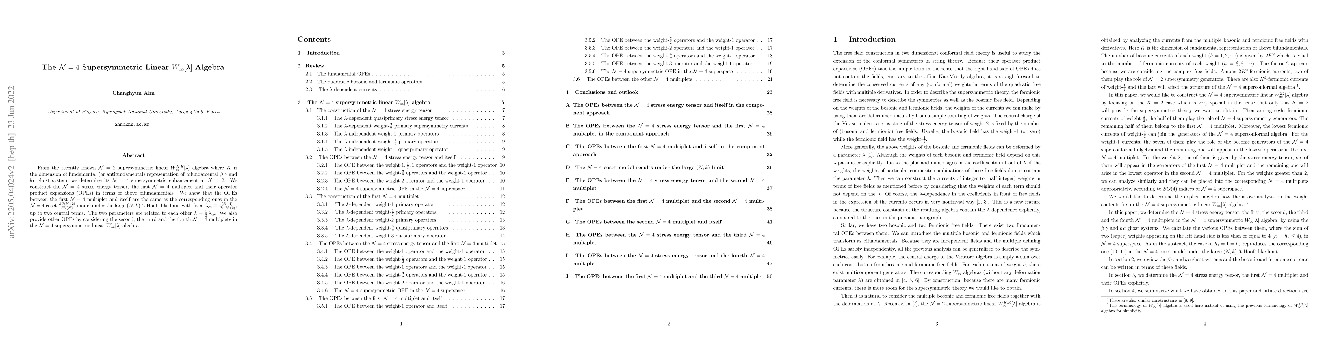This paper constructs the ${\cal N}=4$ supersymmetric enhancement of the ${\cal N}=2$ supersymmetric linear $W_{\infty}$ algebra, determining the ${\cal N}=4$ stress tensor and multiplets, and showing their operator product expansions match those in the ${\cal N}=4$ coset model under specific limits.