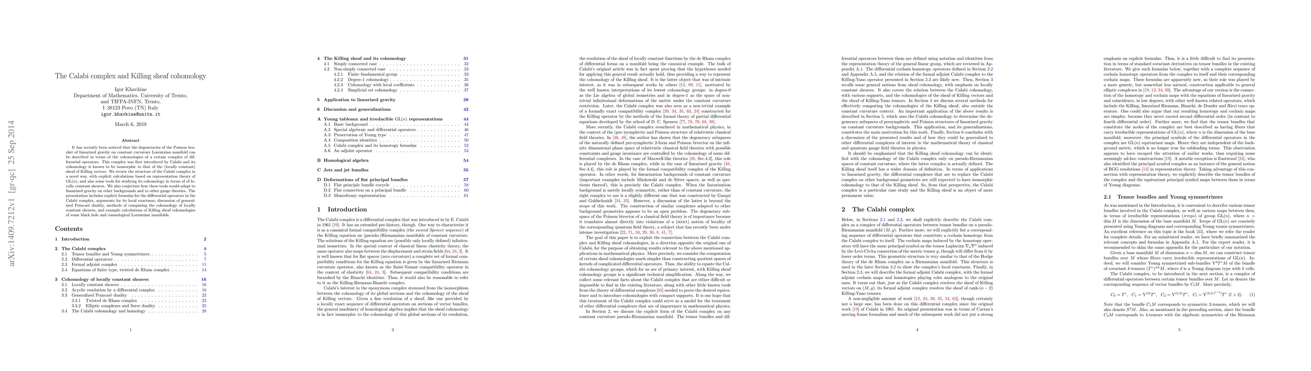 It has recently been noticed that the degeneracies of the Poisson bracket of linearized gravity on constant curvature Lorentzian manifold can be described in terms of the cohomologies of a certain complex of differential operators. This complex was first introduced by Calabi and its cohomology is known to be isomorphic to that of the (locally constant) sheaf of Killing vectors. We review the structure of the Calabi complex in a novel way, with explicit calculations based on representation theory of GL(n), and also some tools for studying its cohomology in terms of of locally constant sheaves. We also conjecture how these tools would adapt to linearized gravity on other backgrounds and to other gauge theories. The presentation includes explicit formulas for the differential operators in the Calabi complex, arguments for its local exactness, discussion of generalized Poincar\'e duality, methods of computing the cohomology of locally constant sheaves, and example calculations of Killing sheaf cohomologies of some black hole and cosmological Lorentzian manifolds.